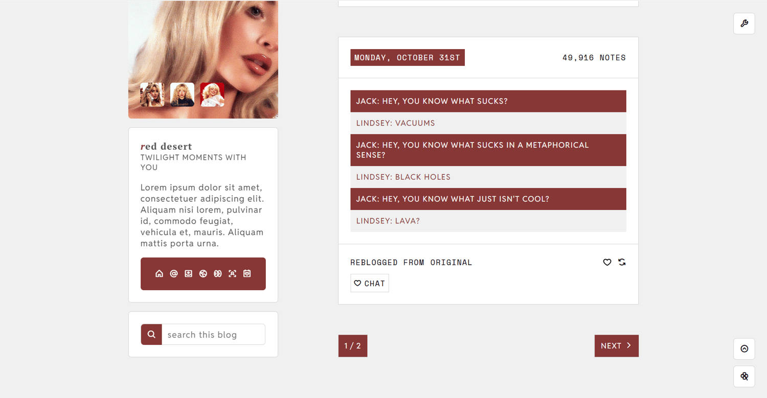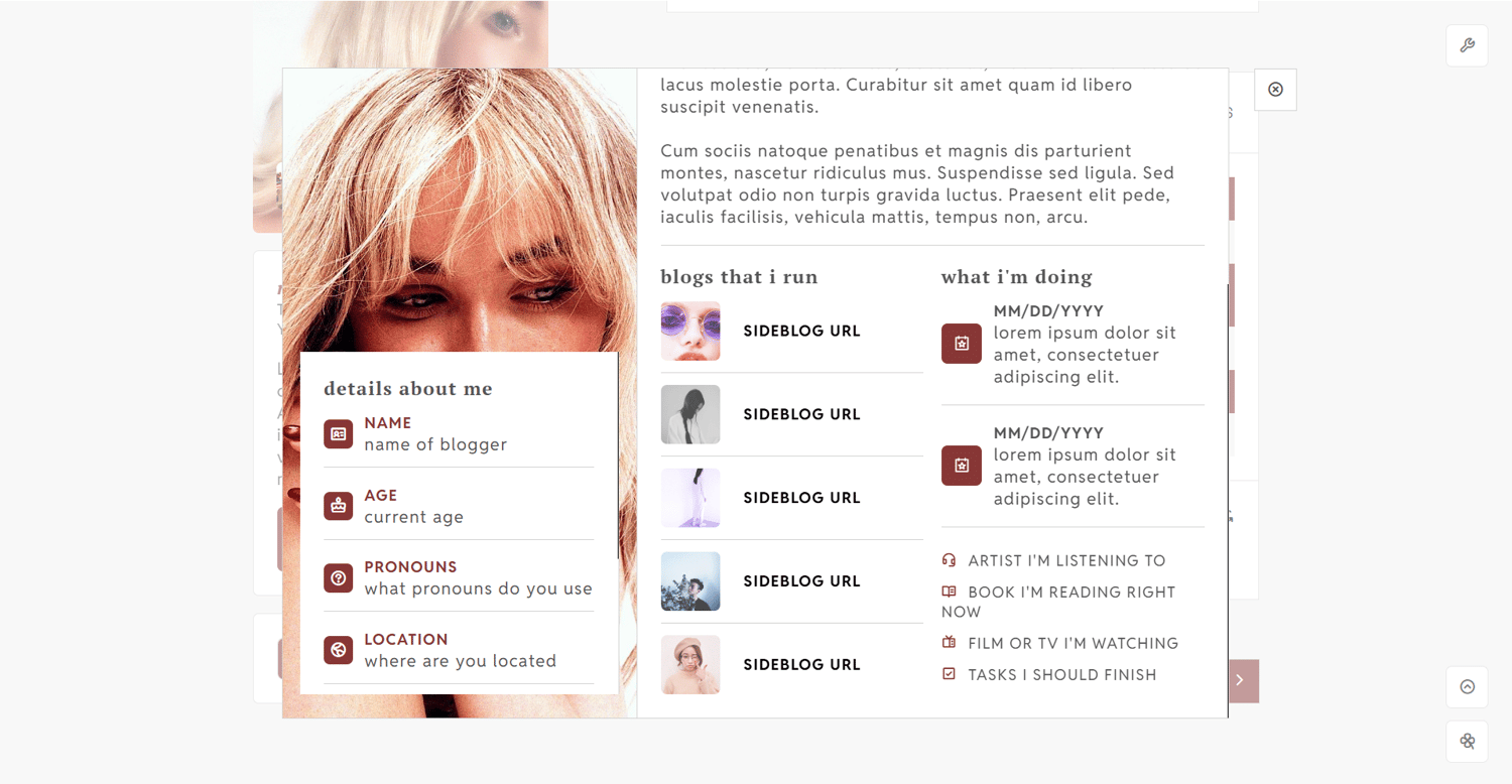sidebar image, three 40x40px icon images, blog title, blog subtitle, seven custom links, 299x550px about image, about info section**, about quote section**, about section**, sideblogs section**, updates and what i do section, 450px to 540px text posts