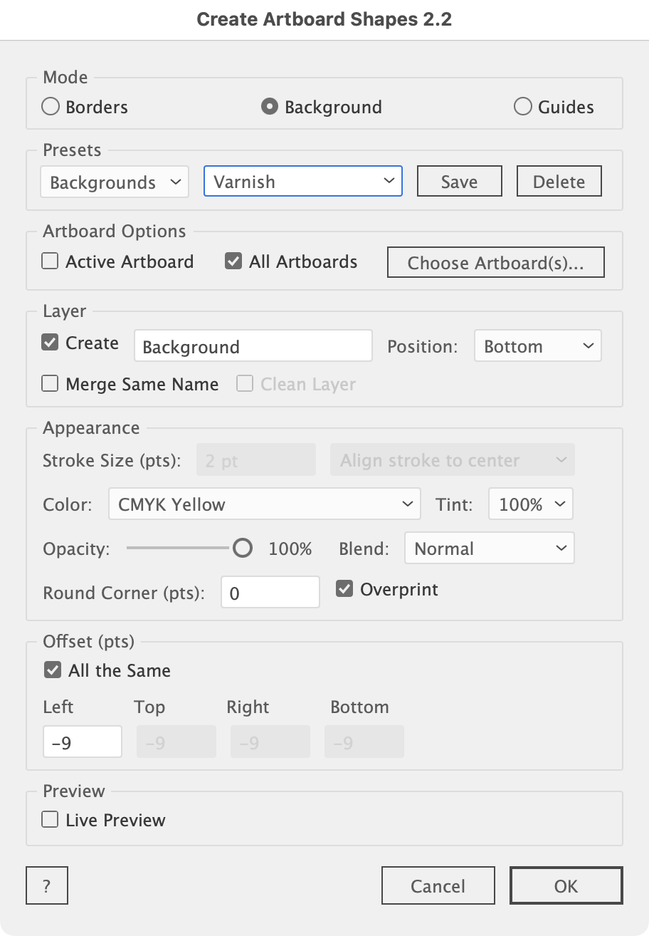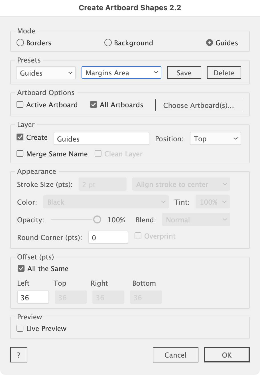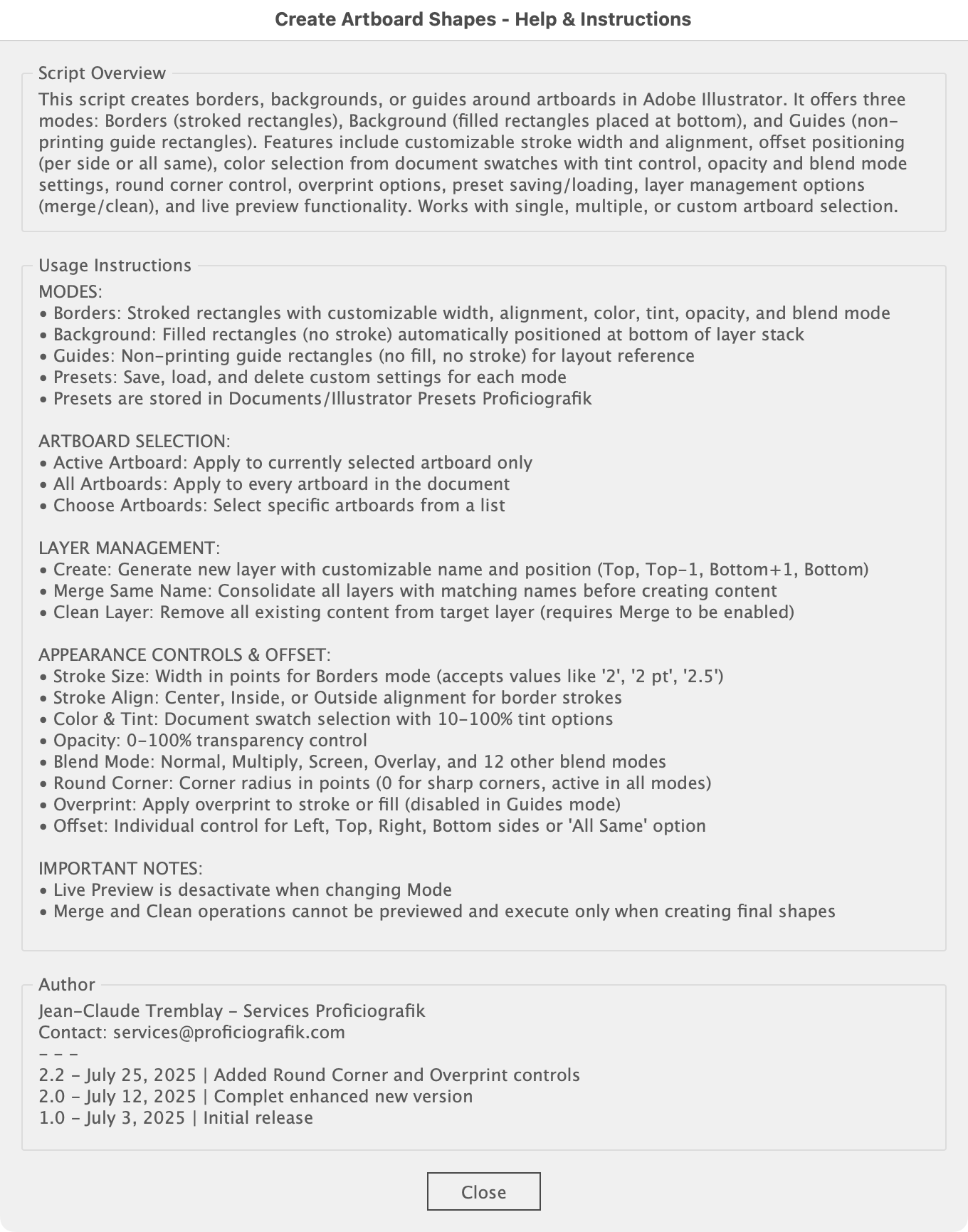 Create Artboard Shapes 2.2 is an Adobe Illustrator script that automates the creation of borders, backgrounds, or guides around artboards with comprehensive control and workflow integration. This latest version introduces round corner control and overprint options, further enhancing its professional printing capabilities.