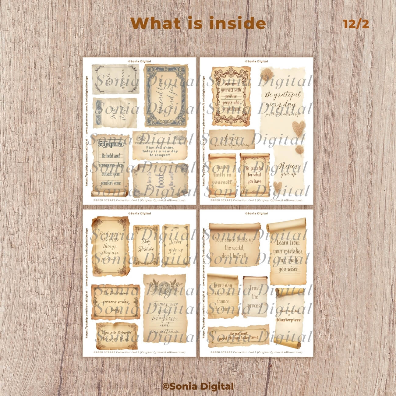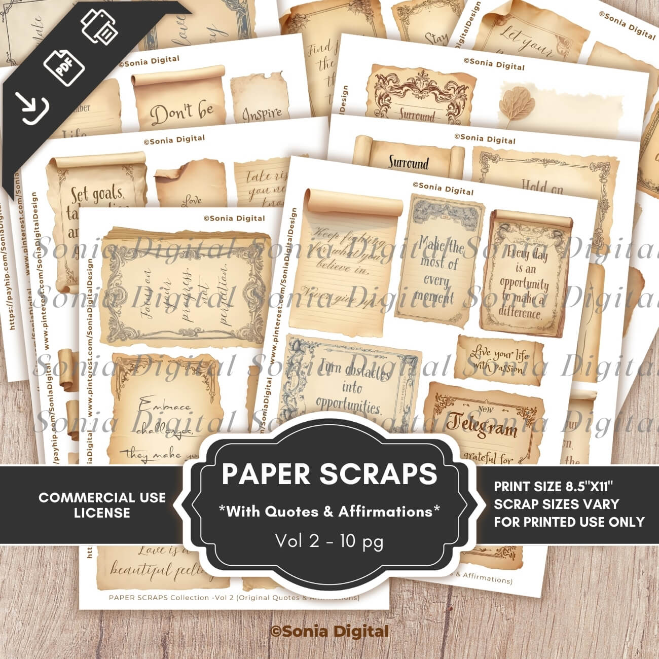 🔸10 printable pages containing Fussy Cuts, “Paper Scraps” Collection (Vol 2) with Quotes and Affirmations. In Letter size, 8.5”x11”. All pages are delivered watermark-free. Paper Scrap Sizes vary. Commercial use license included*.