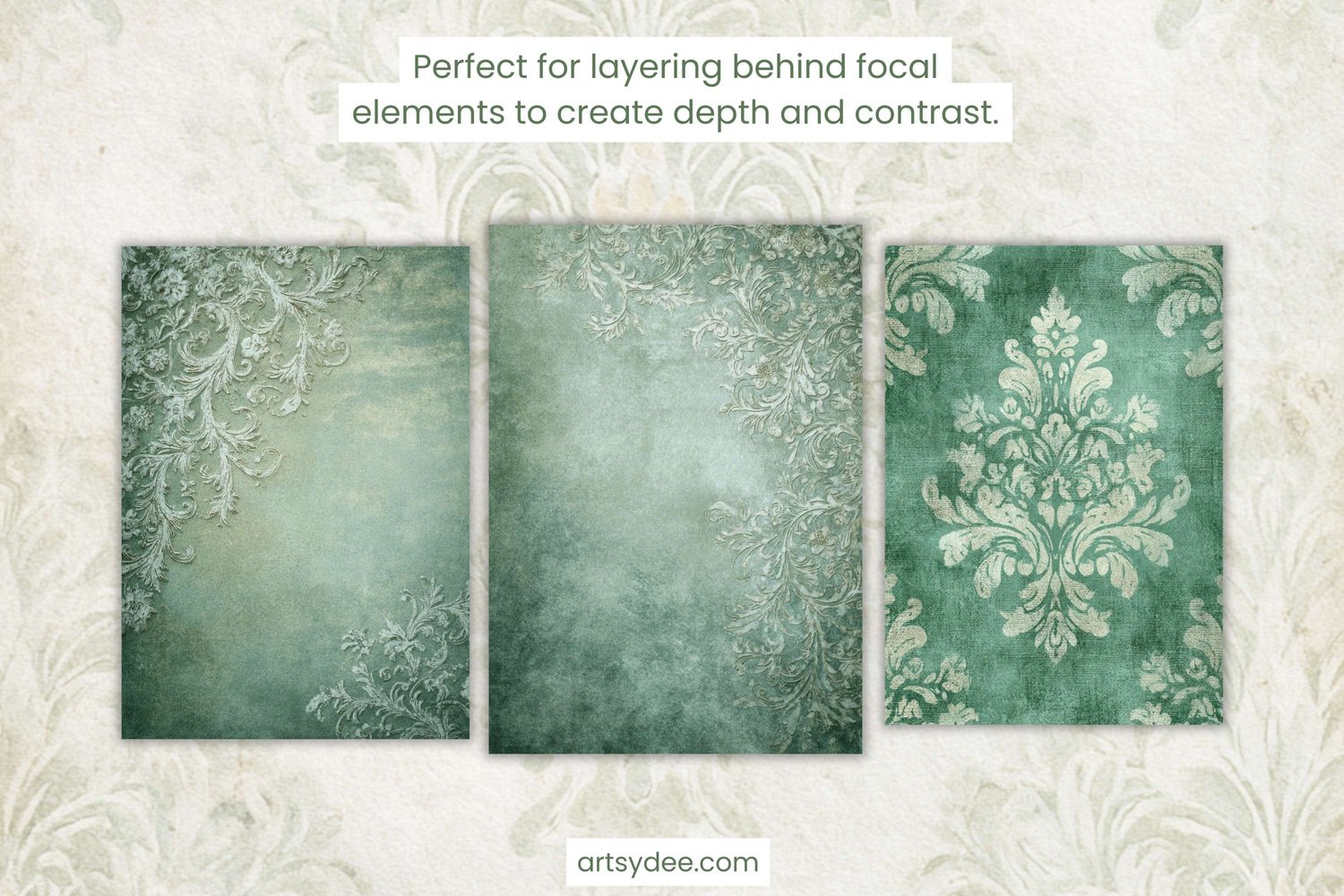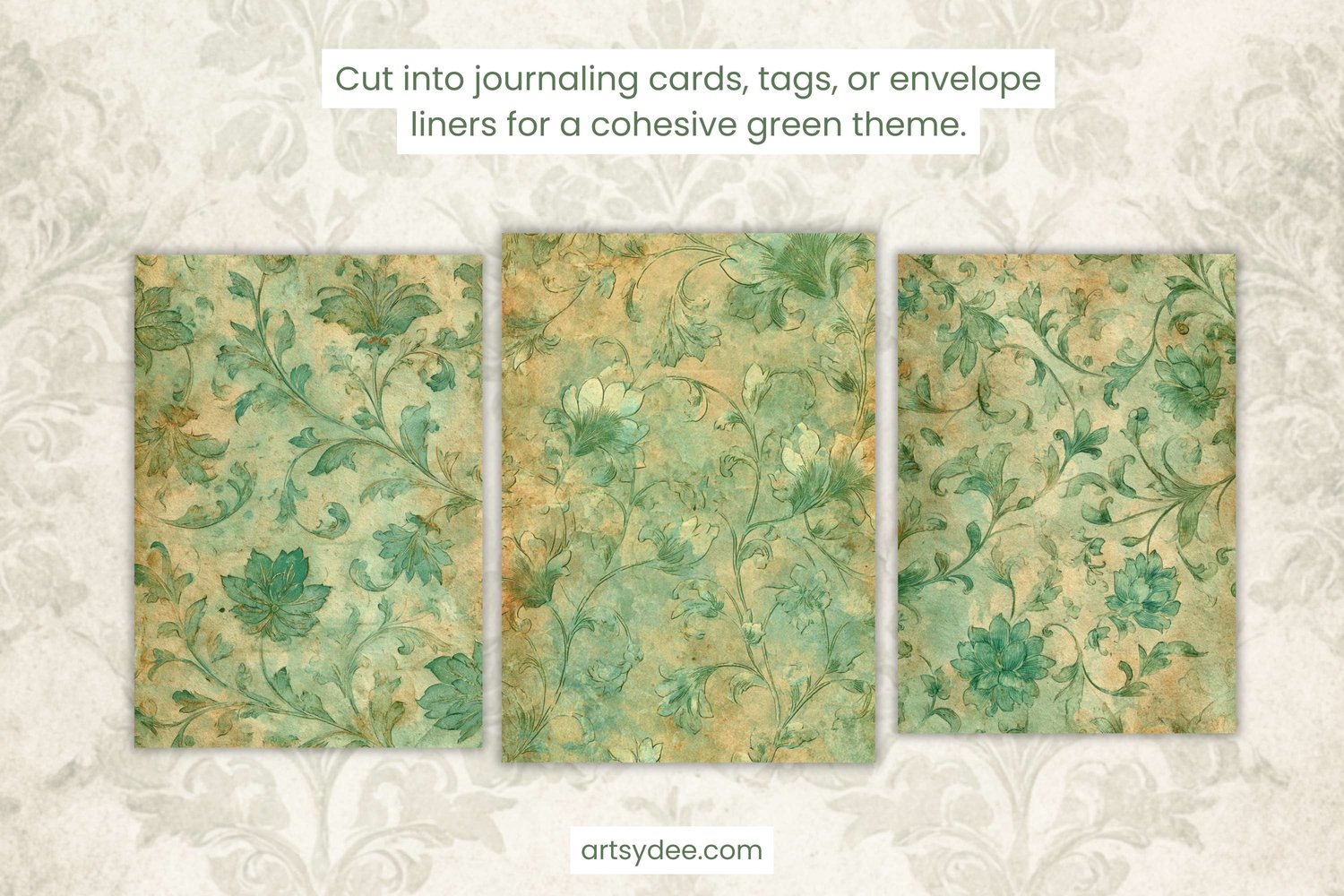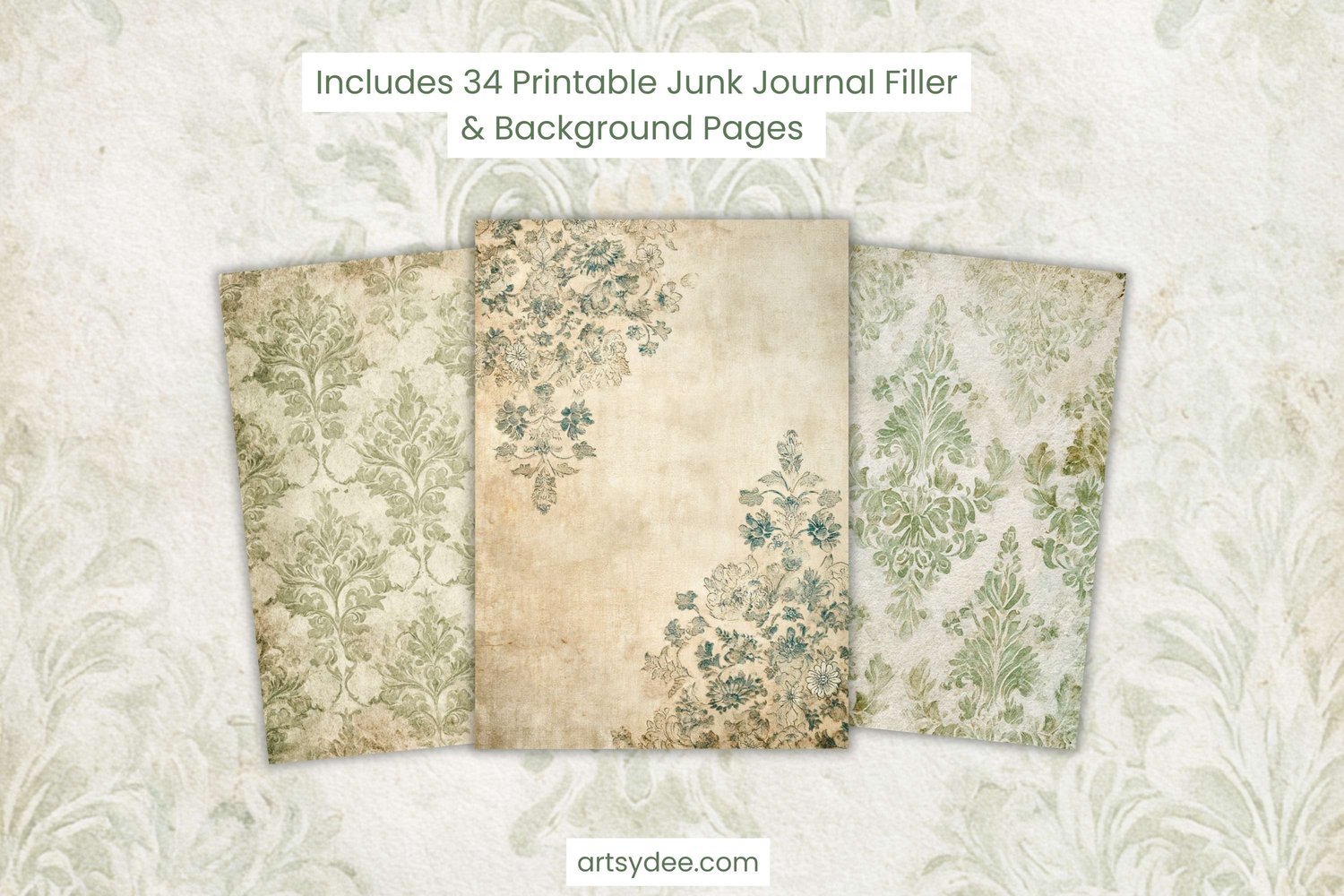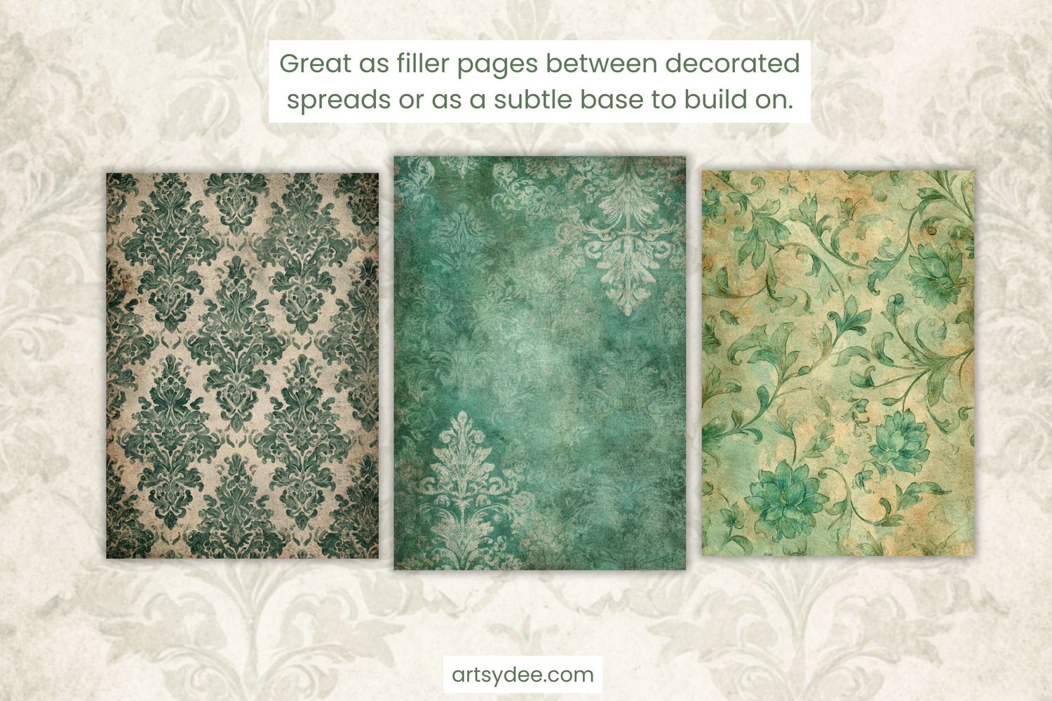 Green Junk Journal, Background Junk Journal Pages, Junk Journal Paper, Filler Papers, Damask, Gingham, Scrapbooking, Green Journal Papers