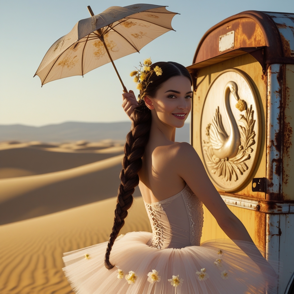 artistic portrait photography of a woman with long, dark brown, intricately braided hair adorned with mimose flowers in the foreground, twirling a vintage umbrella at the upper-right third intersection atop a rusted, worn, ballet trailer roof, with a soft, gentle Festa della Donna smile and en pointe pose, wearing a tulle tutu with blooming petals on the lower-left line, set against a warm, golden, Giallo dune horizon on the bottom third, with a golden rim light igniting delicate fiori puffs against a faded, elegant swan emblem, leading lines from the trailer edge to her warm, inviting gaze, in an Italian, editorial, hyper-realistic style, with shallow depth of field on the sandy dunes, in 8k resolution, with meticulous attention to detail and texture.