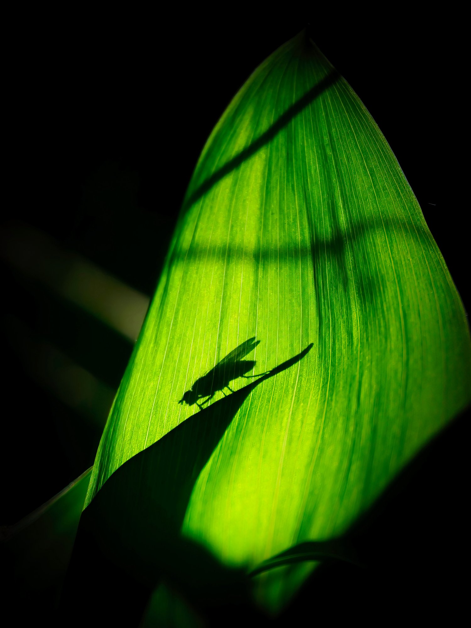Lily of the valley (Convallaria majalis) leaf and a fly behind it.
