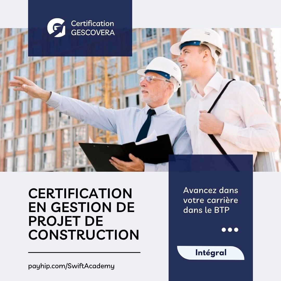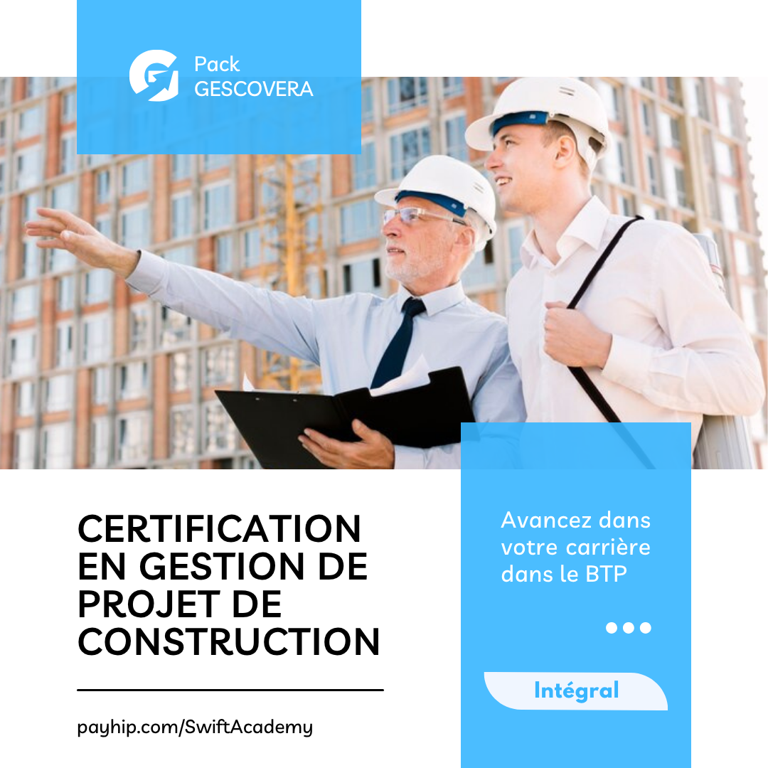 Le Pack GESCOVERA® est une solution certifiée destinée aux professionnels du BTP, aux ingénieurs en génie civil et aux responsables de projets souhaitant approfondir leurs compétences en gestion de projet de construction.