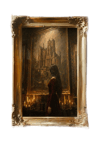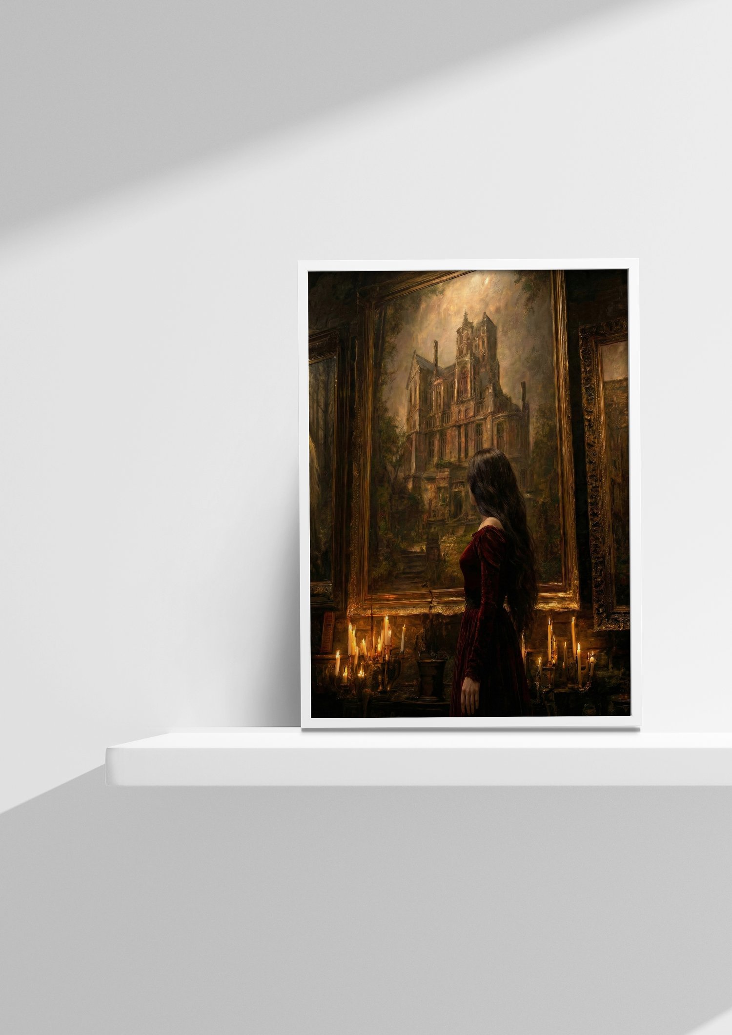 In a chamber lit by trembling candlelight, a lone figure stands before a monumental oil-painted relic — a crumbling castle steeped in ancient sorrow. Time has gnawed at its towers; ivy, ash, and memory cling to its stones. She gazes upward, a silent witness to the fall of forgotten thrones and the echoes that still haunt their ruins.