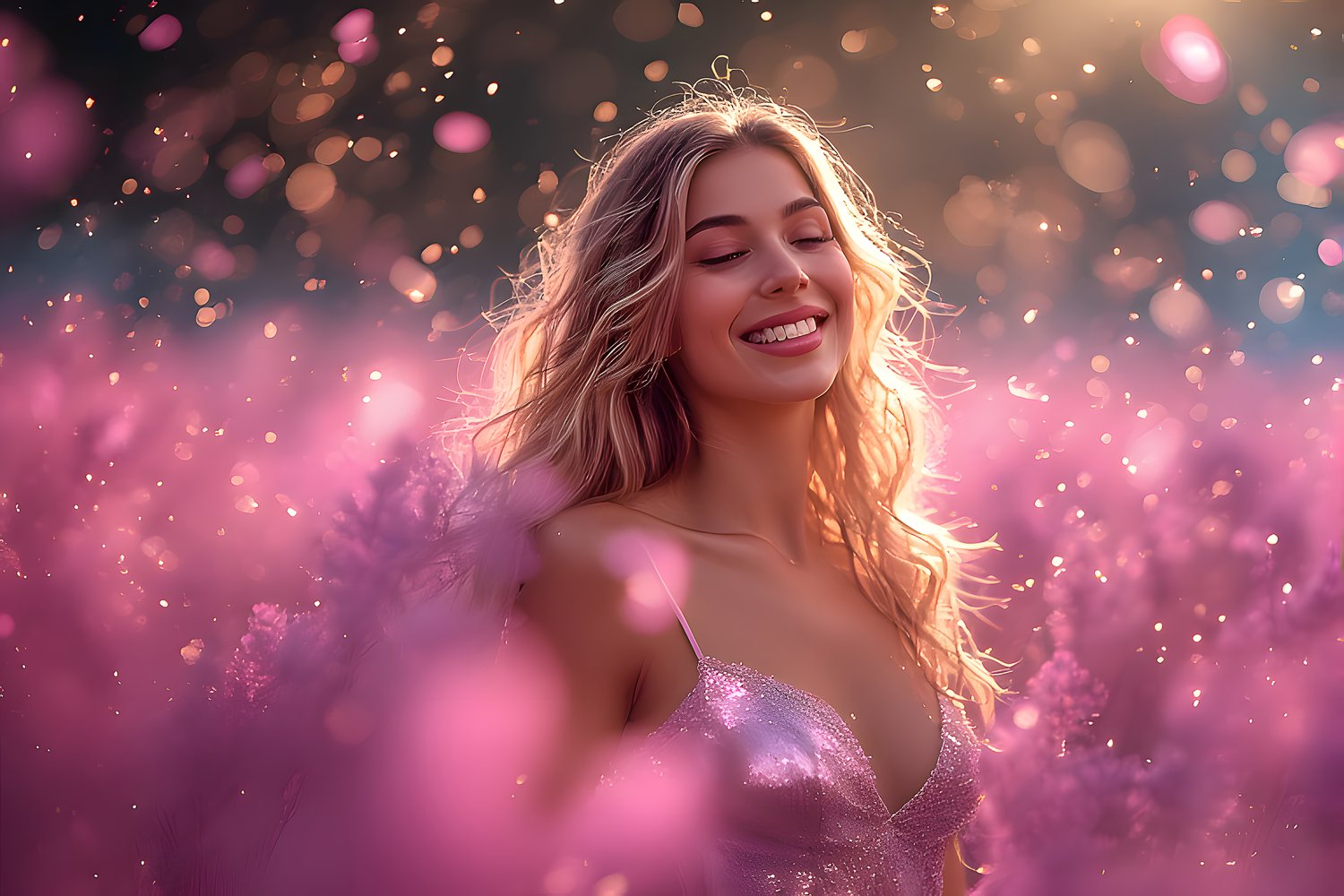 Beautiful lady dressed in pink walking through a field of colorful bright flowers - AI generated