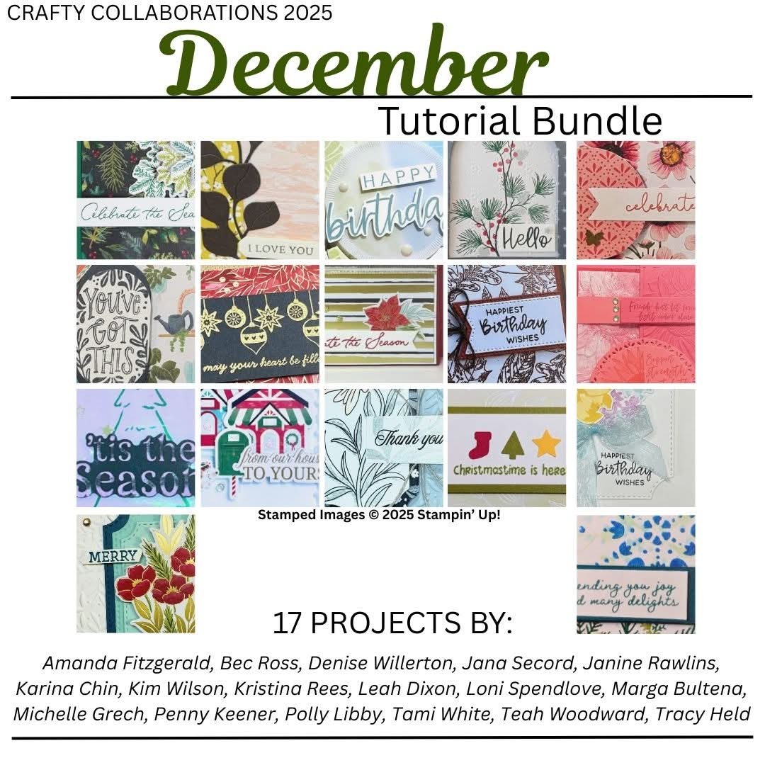 This is a 17 project PDF Tutorial Bundle using current ( as of December 2025) Stampin' Up! Product. The designs were created by a wide variety of Stampin' Up! Demonstrators who are part of the Crafty Collaborations group.