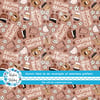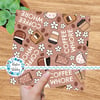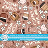Coffee Whore featuring mugs, cups, pots, beans and flowers on tan.