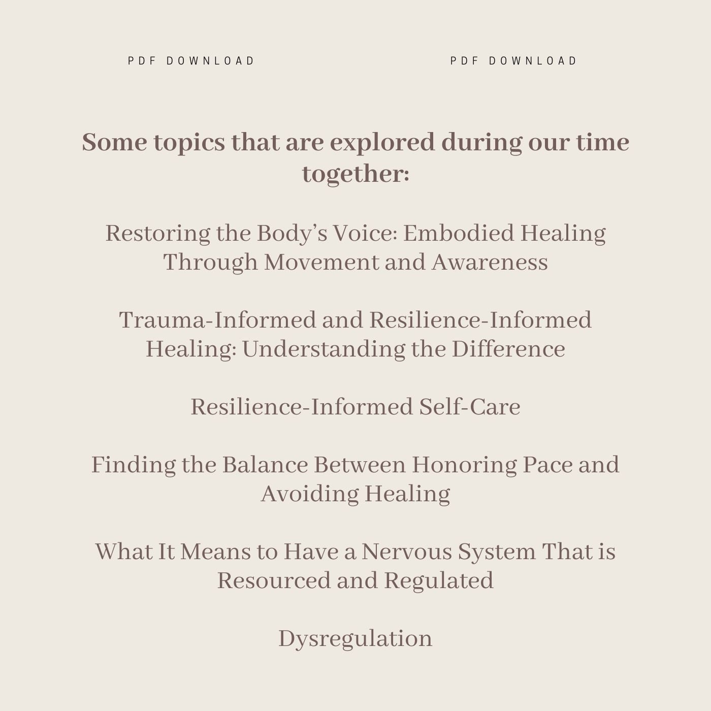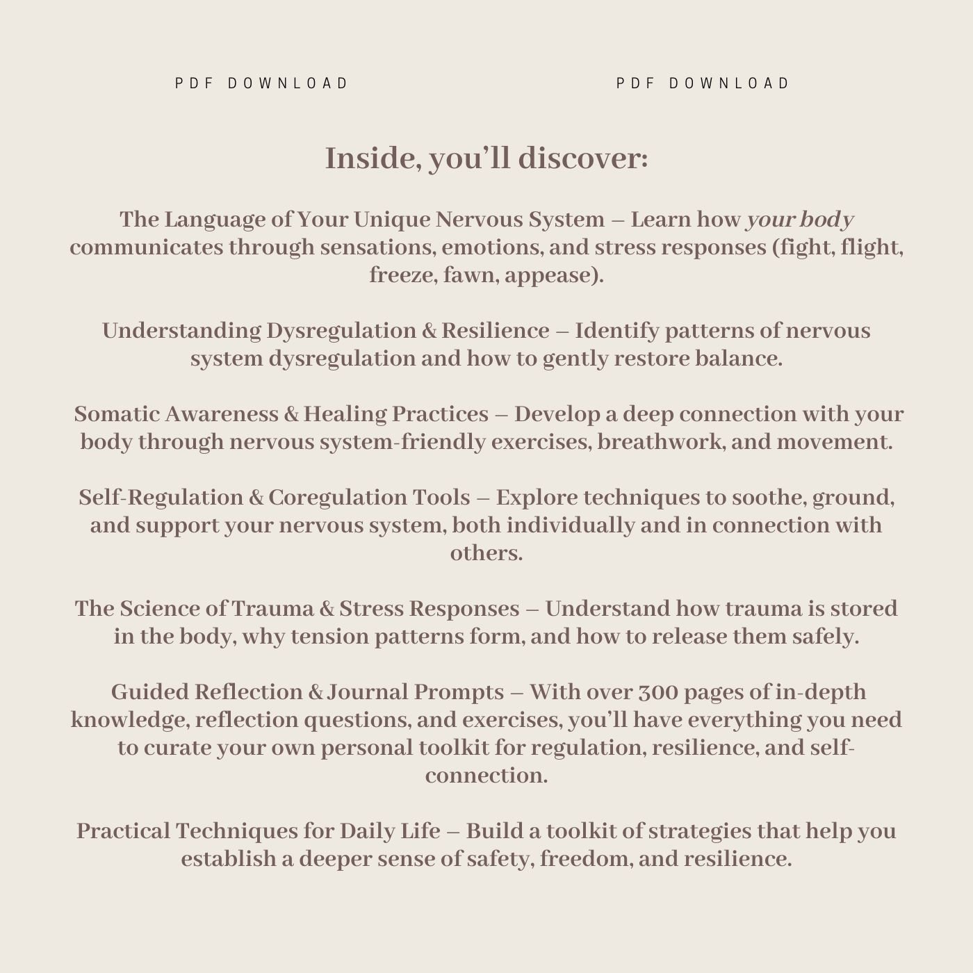 This isn’t just another healing tool. It’s a thoughtfully designed, body-up approach to self-regulation that meets you where you are. With guided exercises, reflection prompts, and practical tools, this resource helps you cultivate safety, resilience, and self-awareness from the inside out.