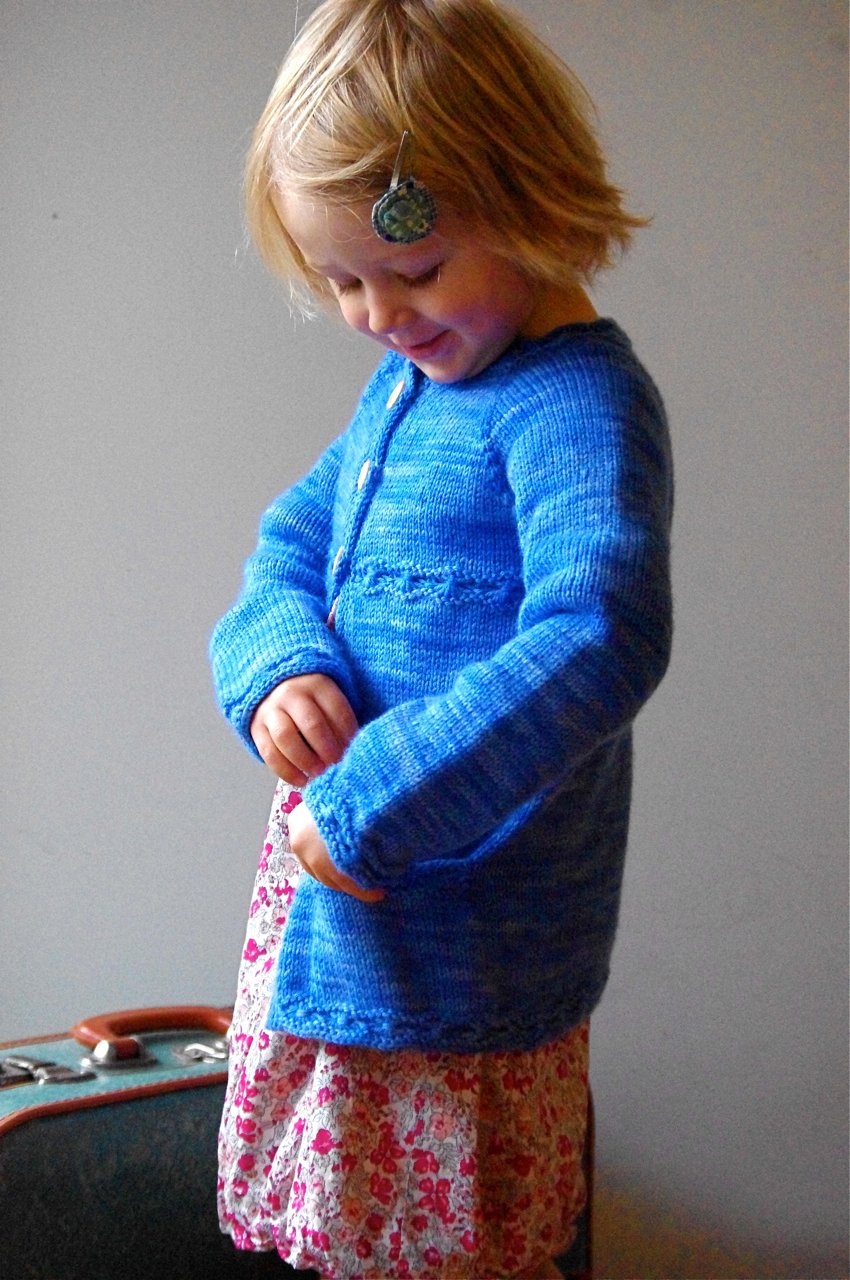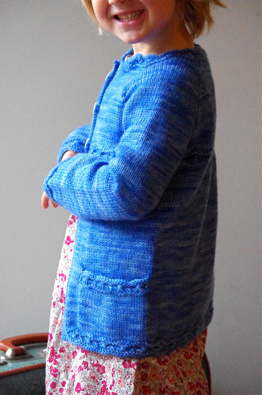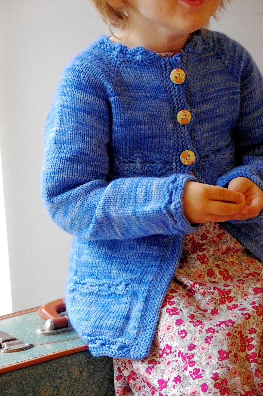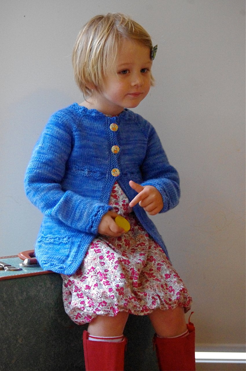This gorgeous wee cardigan is light, airy and darling; perfect for any time of the year and any outfit. The sweet little pockets encourage collecting and flower picking. Knit in beautiful dk/8ply weight yarn, this is a delightful seamless cardie adorned with a daisy stitch and subtle back gathers.
