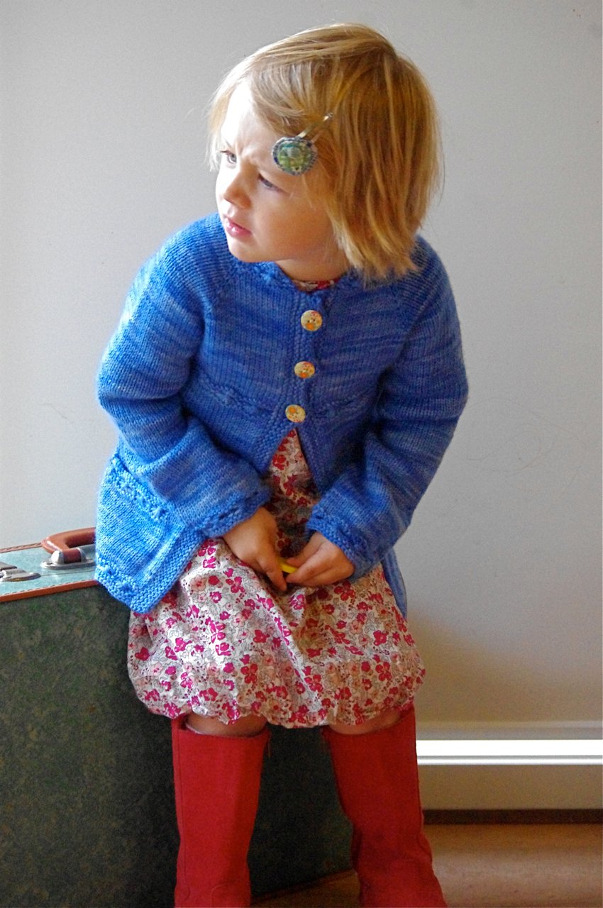 Annie is a seamless raglan cardigan knit from the top down. The body is knit flat and the sleeves are knit in the round. Button-bands are integrated into the garment as it is knit.