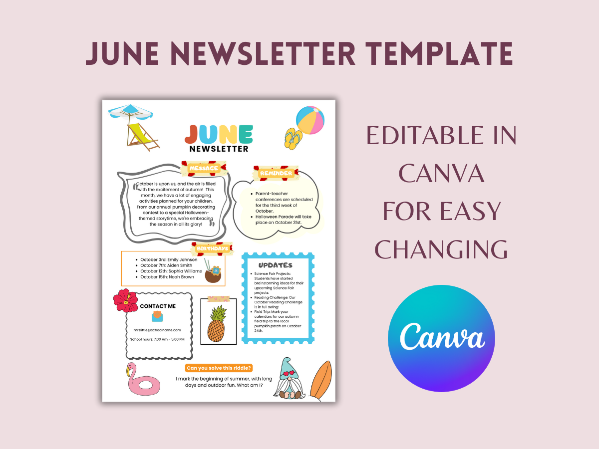 This June Monthly Teacher Newsletter Canva Template is an easy-to-use template and customizable in Canva. Stunning newsletter templates are customizable using the free version of Canva. Designed for teachers, administrators, and PTA members, the School newsletter templates are perfect for anyone looking to add a touch of something different to their school communications. Whether you're announcing upcoming events, sharing important updates, or celebrating student achievements, these templates have you covered. Create monthly newsletters to keep parents informed about school events and activities. Our newsletter template bundle is perfect for preschools, PTA newsletters, daycares, homeschool, and church youth groups, and can be changed up for a community flyer.