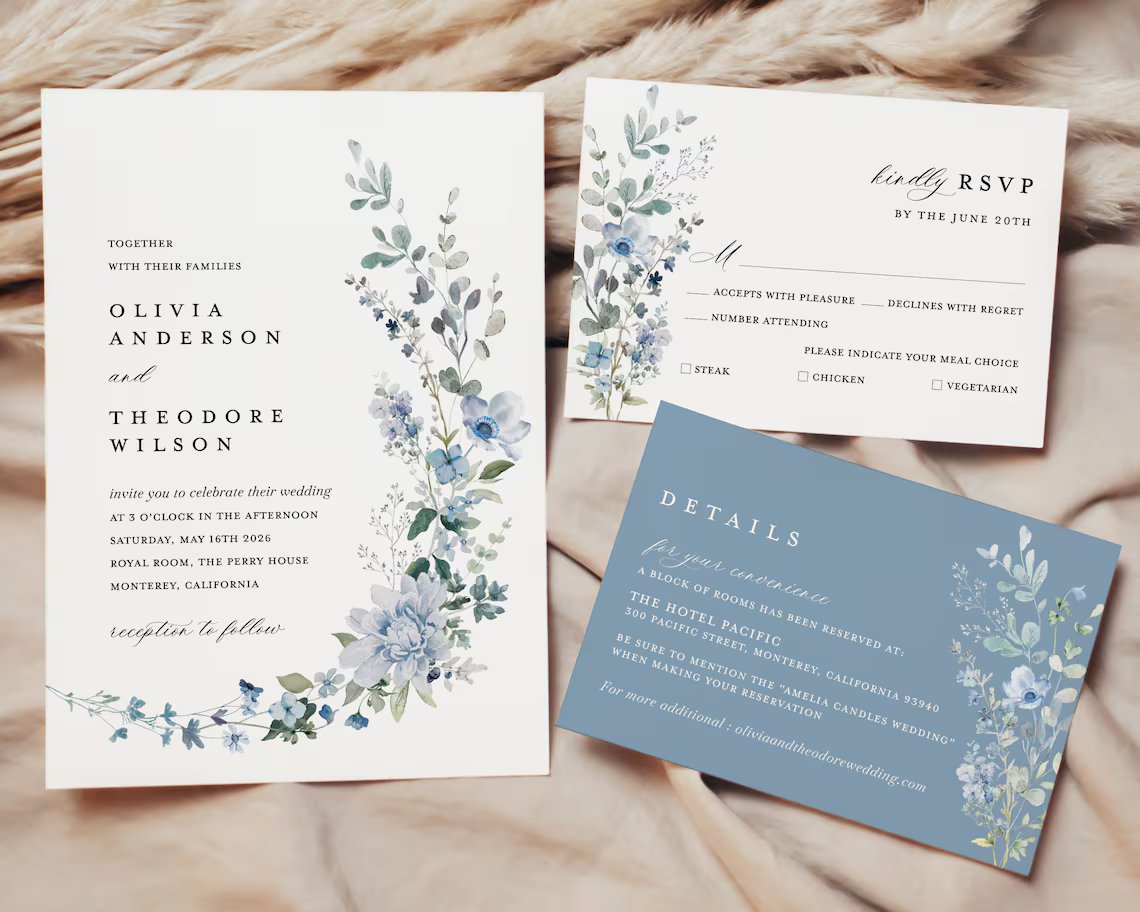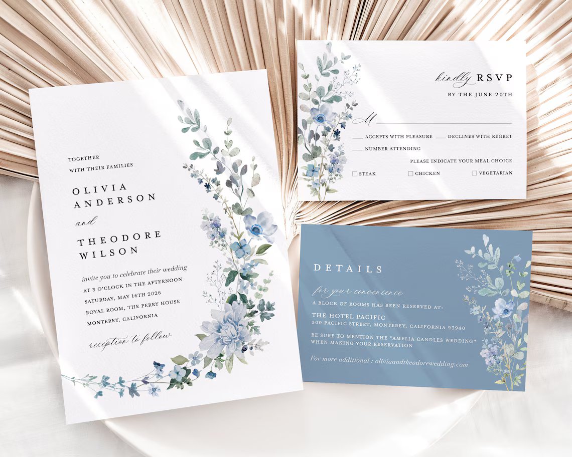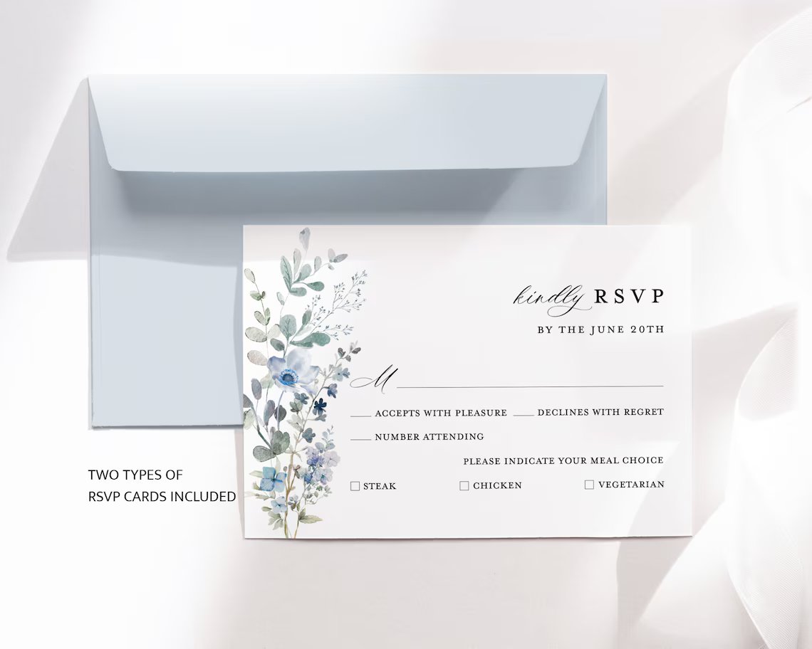 Dusty Blue Wedding Invitation Template Set, Boho Wildflower Wedding Invite Suite, Elegant Floral Light Steel Blue Details, RSVP, Download
