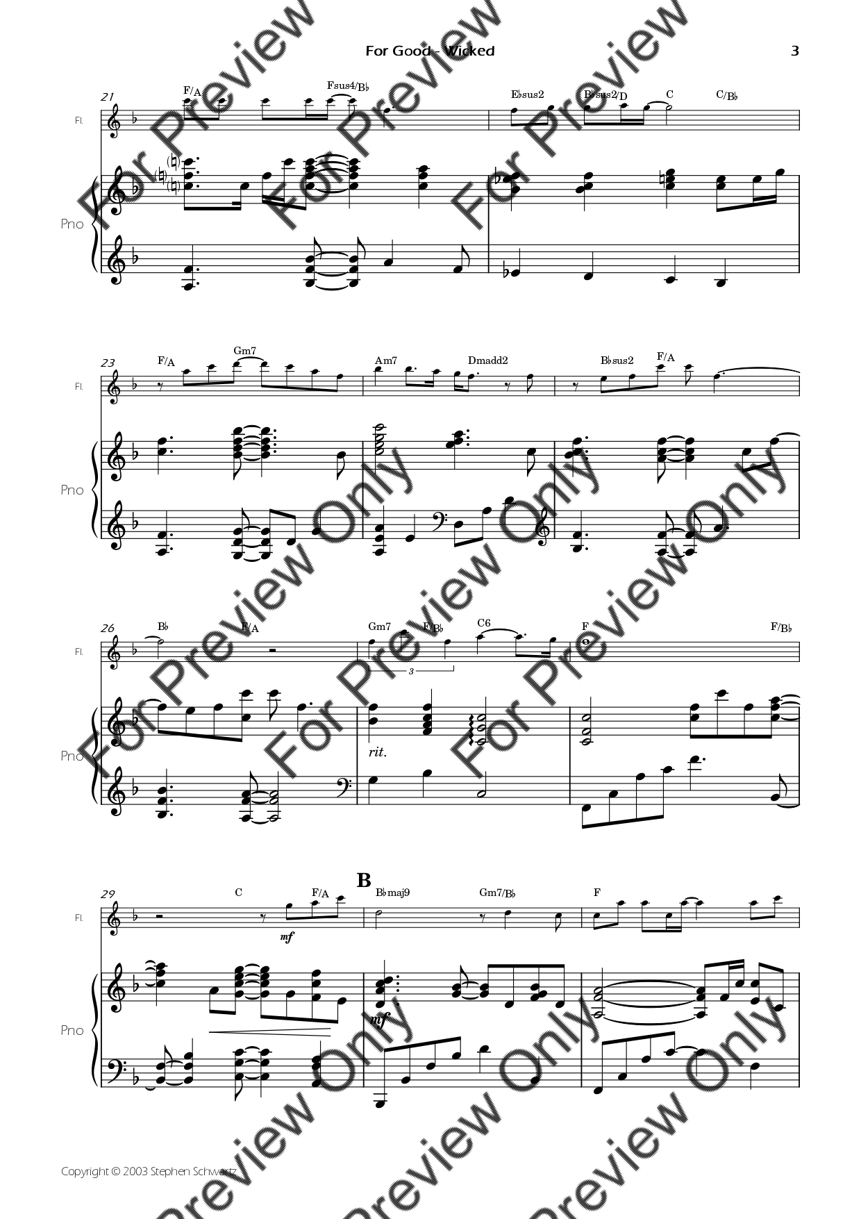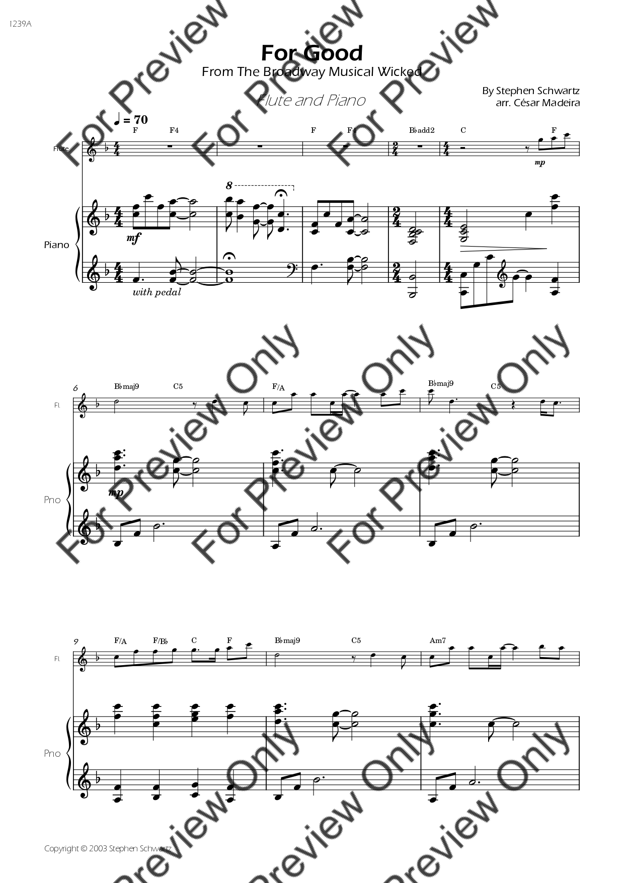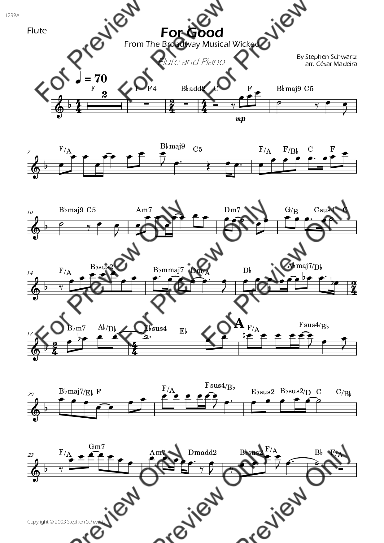 For Good from Wicked by Stephen Schwartz. Arrangement for Flute and Piano. With Full Score and Individual Parts. Have fun!