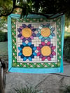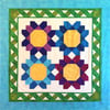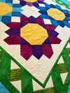 Four giant flowers make the center of this quilt feel like you are in a fantastic garden, with greenery and blue sky all around. This 50" quilt can be a wallhanging or a table-topper, a colorful addition to your home.