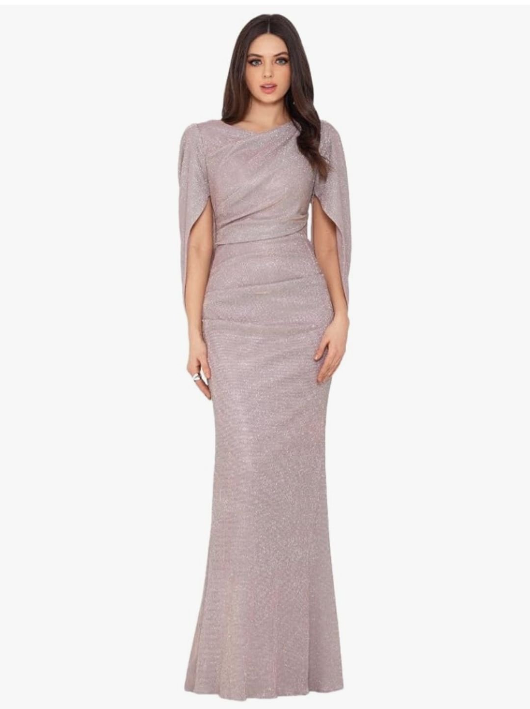 Betsy & Adam Women's Long Glitter Cape Sleeve Dress with Draped Neckline and Hidden Back Zipper.