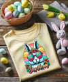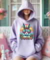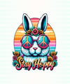 🌞✌️ A groovy, retro-inspired Easter bunny wearing peace-sign sunglasses and a floral crown! With a vintage sunset background and "Stay Hoppy" text, this design radiates 70s vibes!