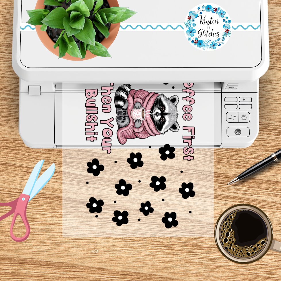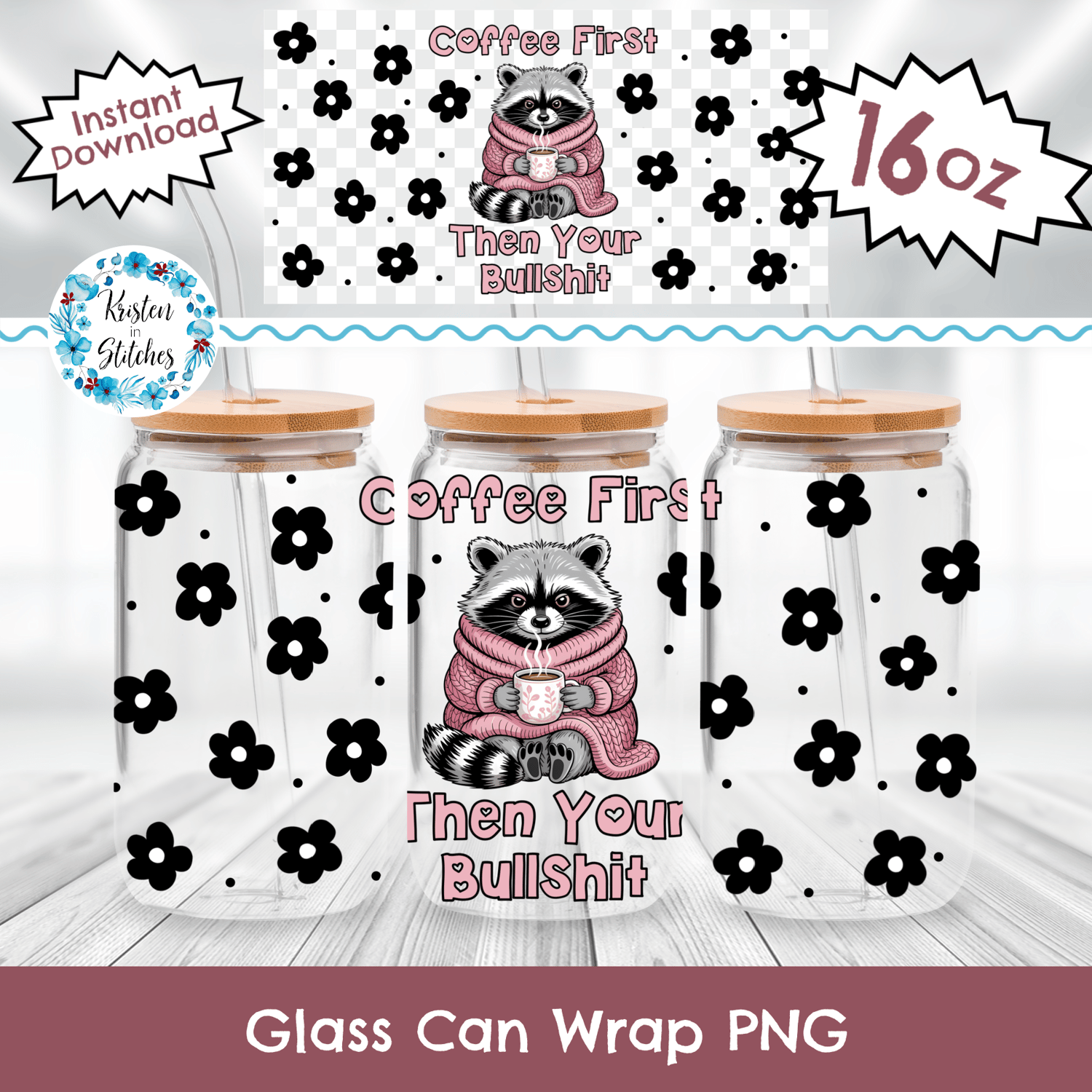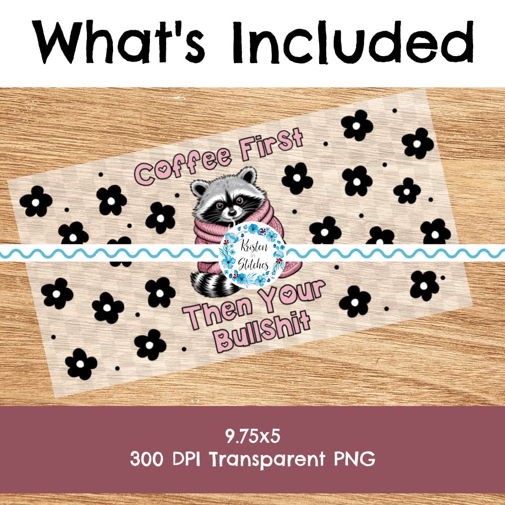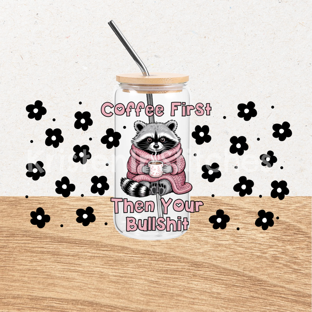 Coffee First Then Your Bullshit 16 oz Glass Can Wrap Transparent PNG, Sassy Raccoon