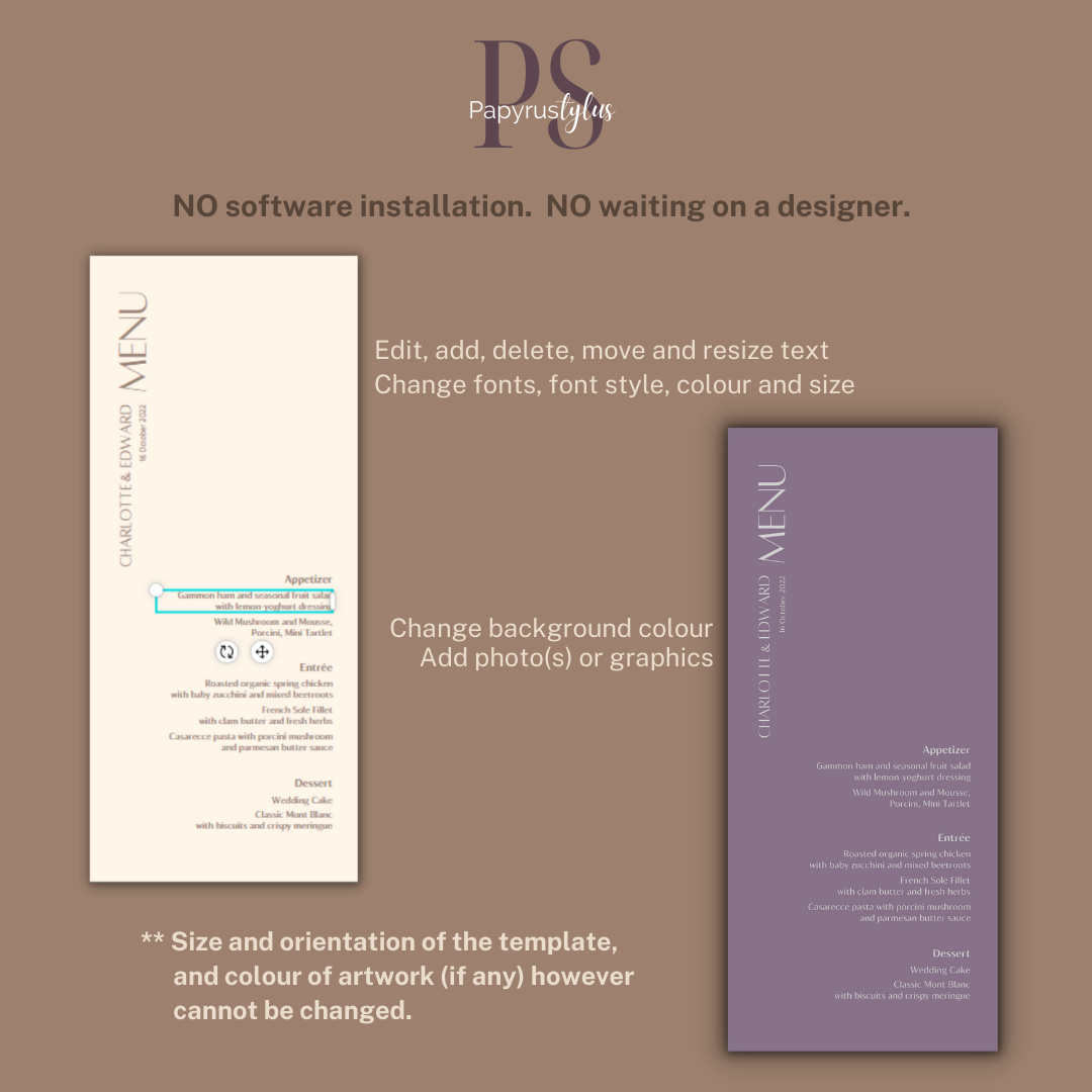 - Size and orientation of the ready-made template(s) and colour of artwork (if any) cannot be modified.