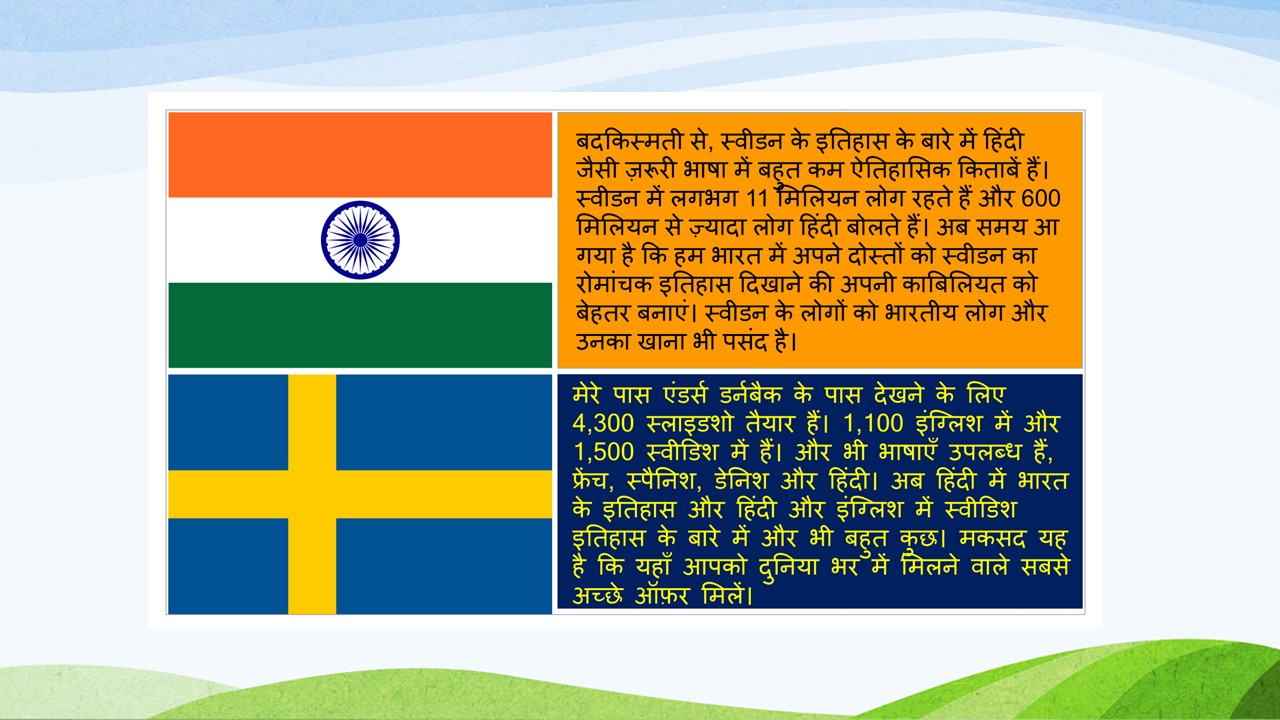 बदकिस्मती से, स्वीडन के इतिहास के बारे में हिंदी जैसी ज़रूरी भाषा में बहुत कम ऐतिहासिक किताबें हैं। स्वीडन में लगभग 11 मिलियन लोग रहते हैं और 600 मिलियन से ज़्यादा लोग हिंदी बोलते हैं। अब समय आ गया है कि हम भारत में अपने दोस्तों को स्वीडन का रोमांचक इतिहास दिखाने की अपनी काबिलियत को बेहतर बनाएं। स्वीडन के लोगों को भारतीय लोग और उनका खाना भी पसंद है।