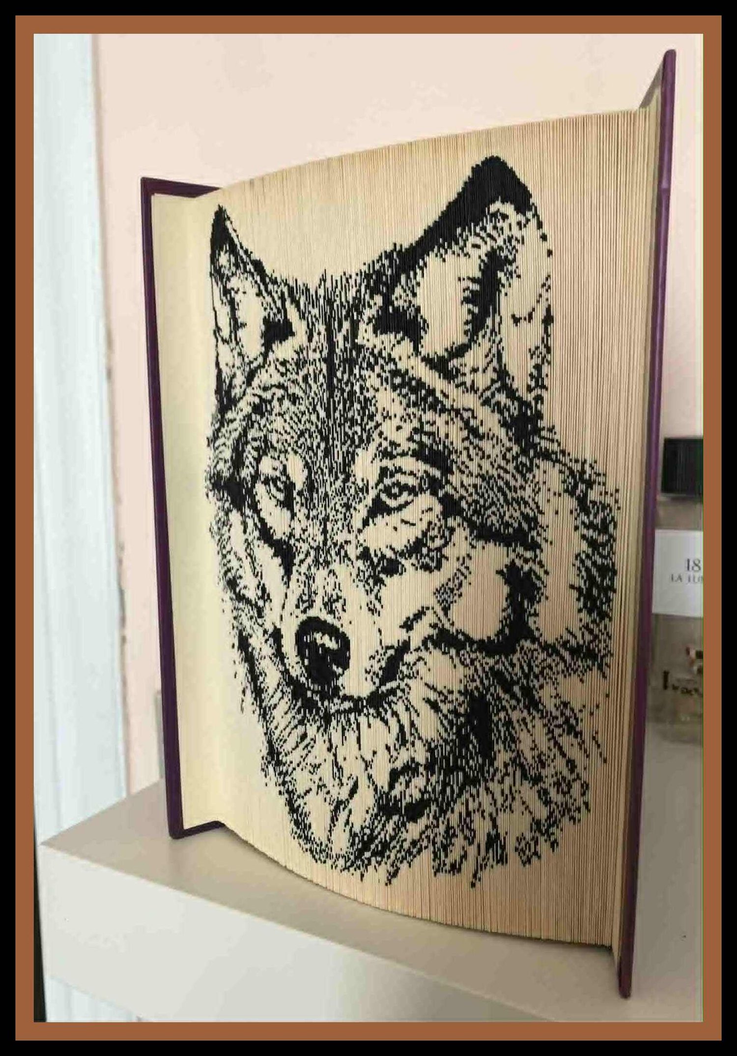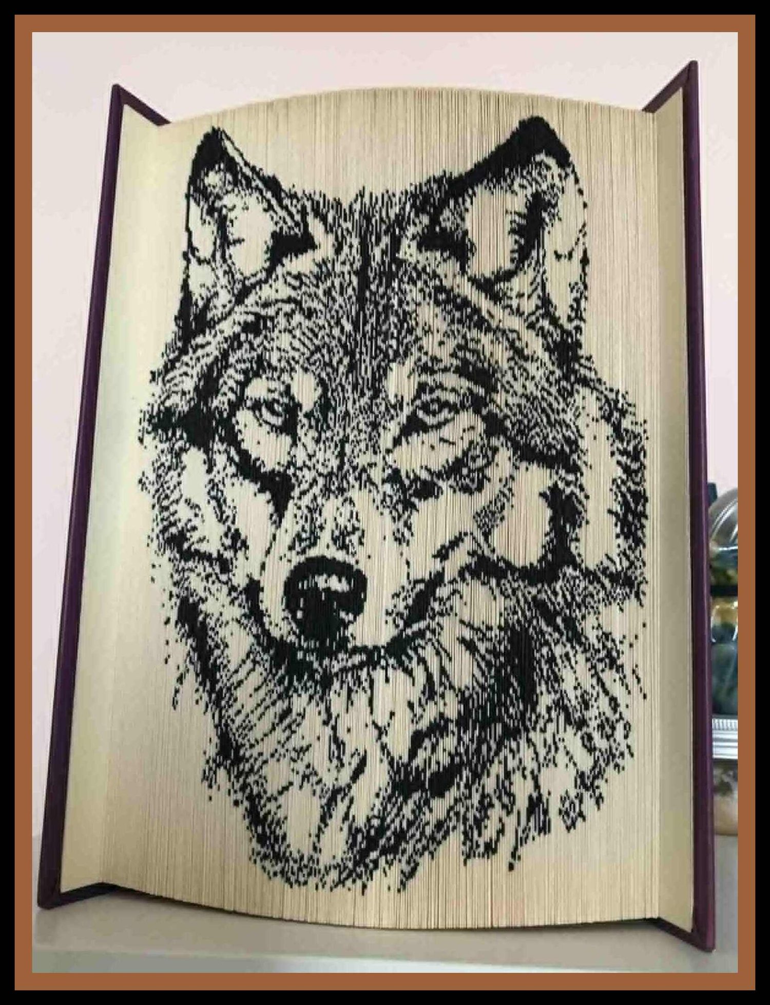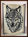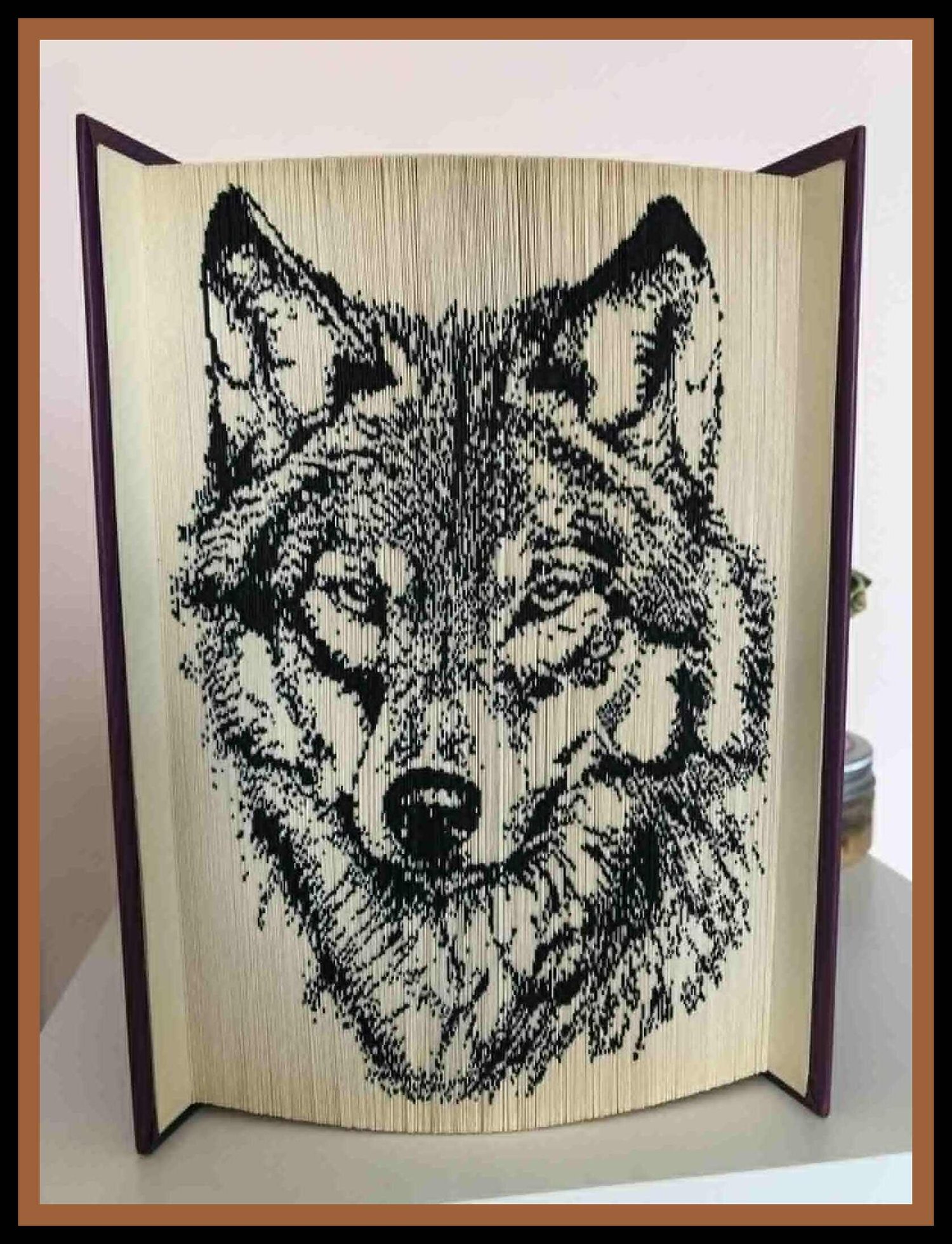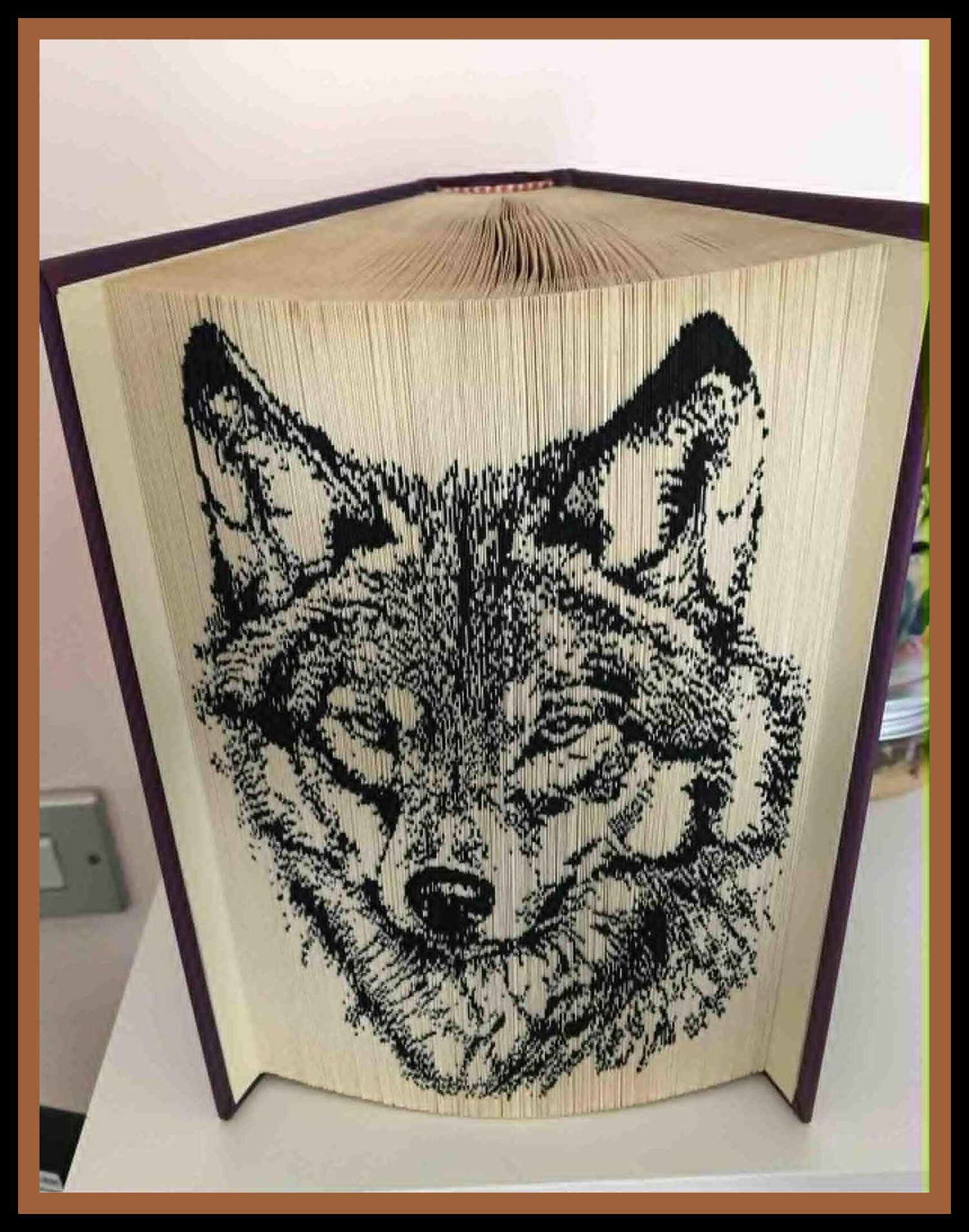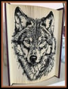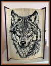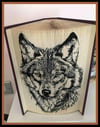 This beautiful folded book art pattern features a two-toned wolf portrait, created using striking contrast between light and dark page folds. The bold shading technique enhances the depth of the fur and facial features, giving the wolf a lifelike and expressive appearance.
