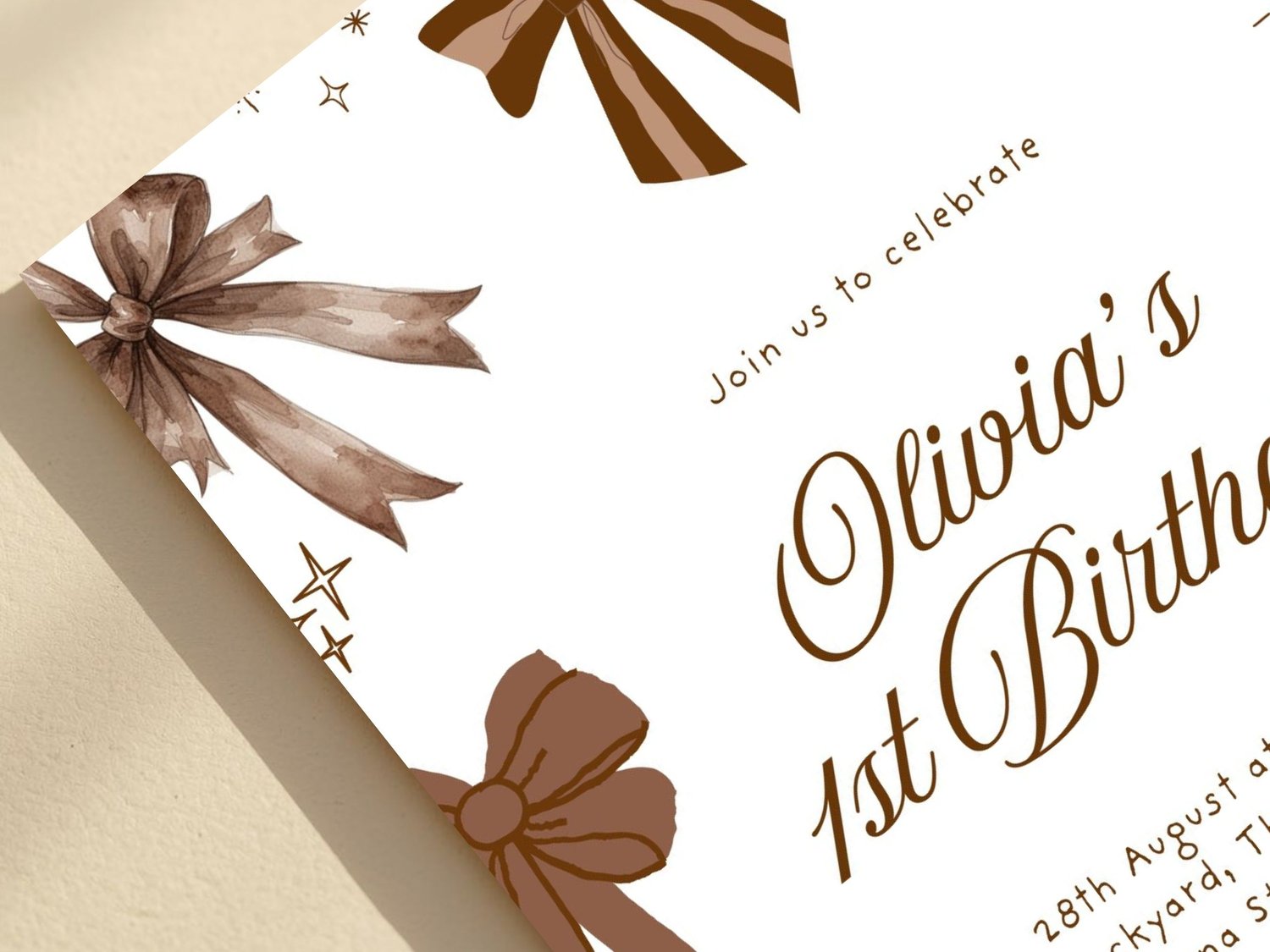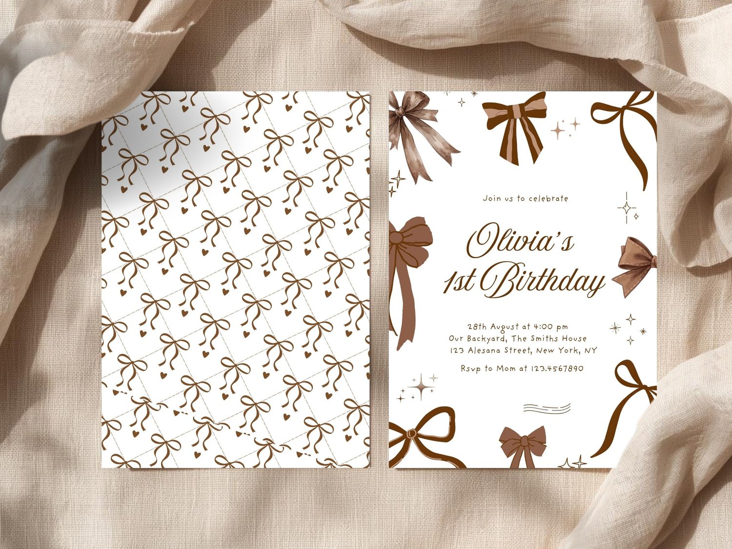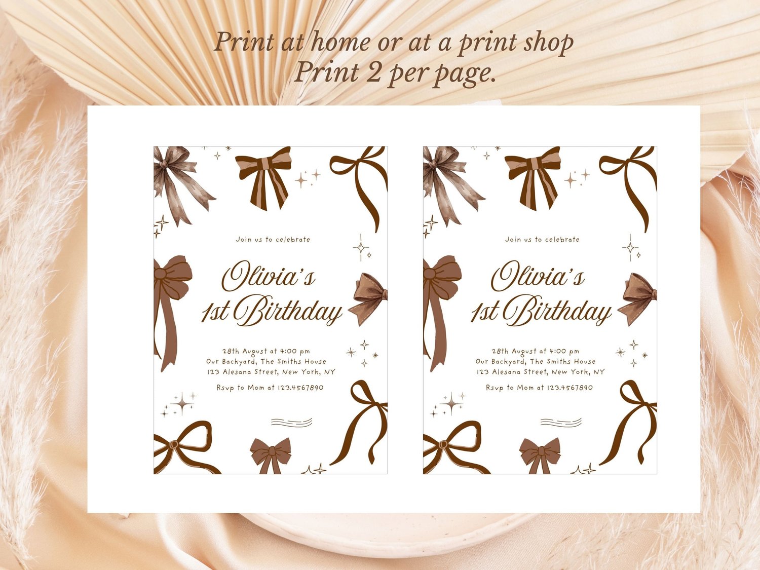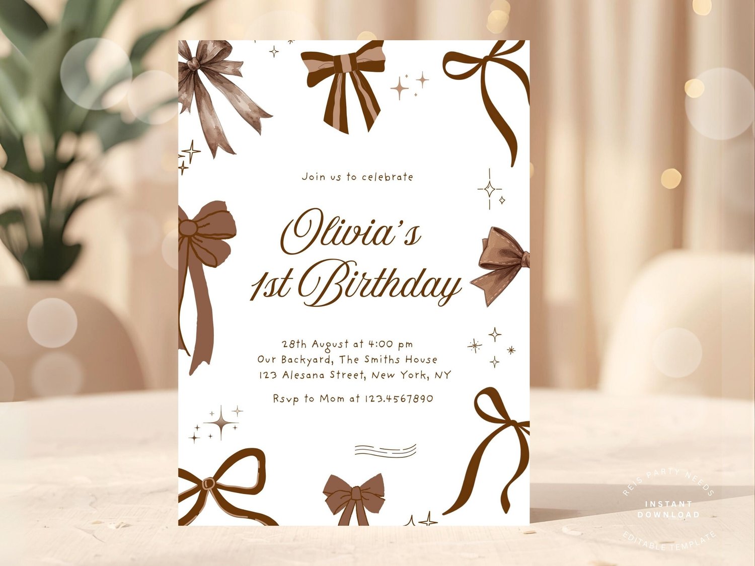Bow Birthday Invitation Editable Girl First Birthday Invite Chocolate Mocha Bow 1st Birthday Any Age Party Coquette Template Printable