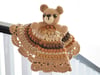 • Red Heart Super Saver Yarn; Weight category: 4 / Worsted; Qty: 1⁄2 skein of Warm Brown for bear and edging, a small amount of Buff for muzzle, a small amount of Coffee and White for eyes and nose.
