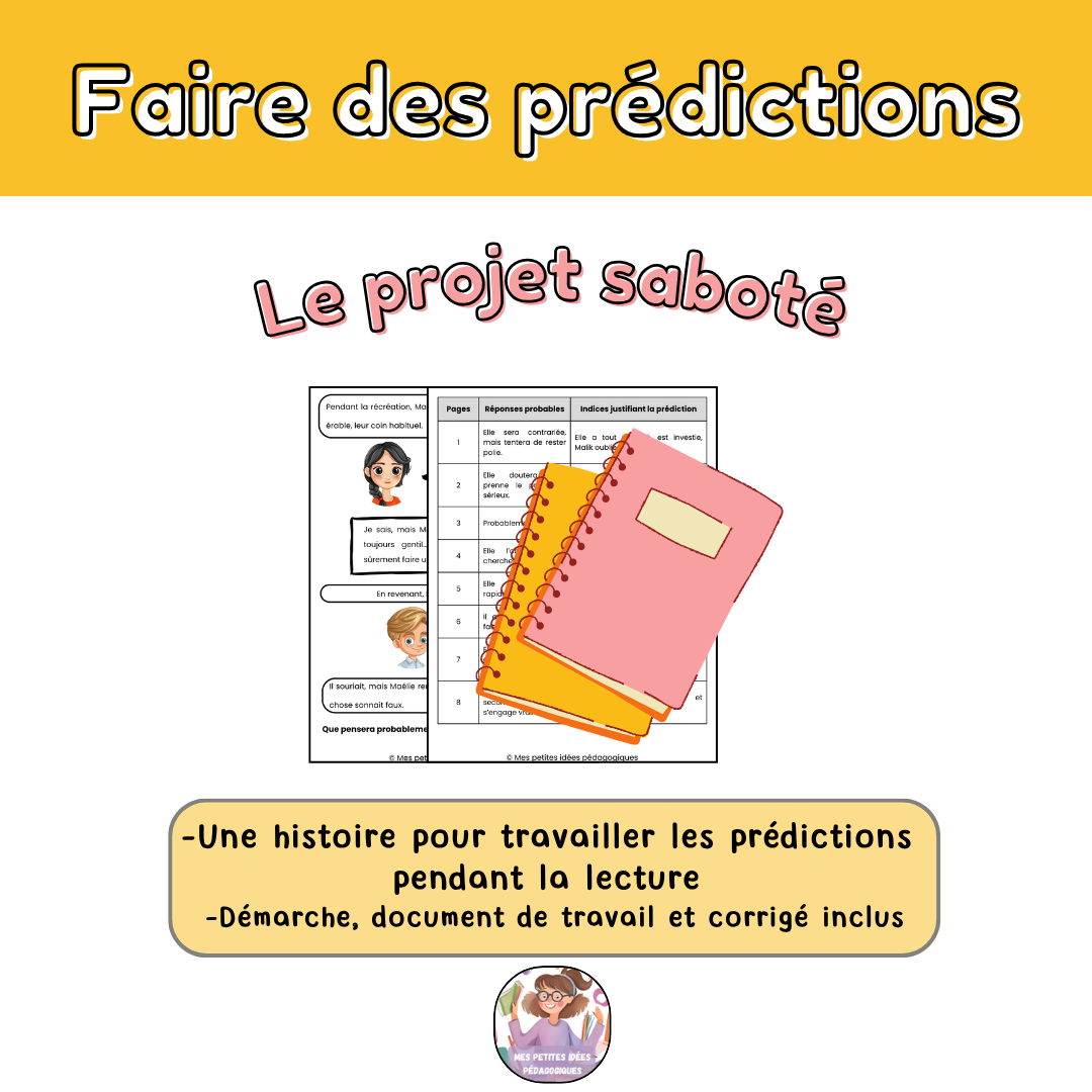 Une histoire d’environ 10 pages pour travailler la prédiction pendant la lecture. L’élève lit l’histoire et il doit s’arrêter à chaque page pour prédire la suite à partir d’une question posée. Le document inclut également une fiche pour écrire les réponses ainsi que le corrigé.