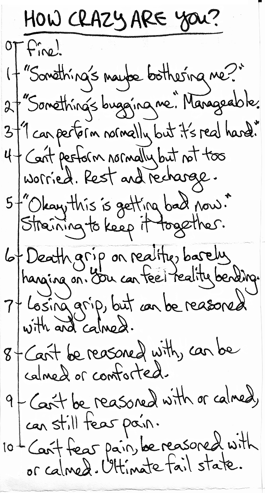 the Psychological Badness Scale: Our own personal scale for measuring our crazy. We urge you to make your own; it's the foundation for all other crisis plan stuff.