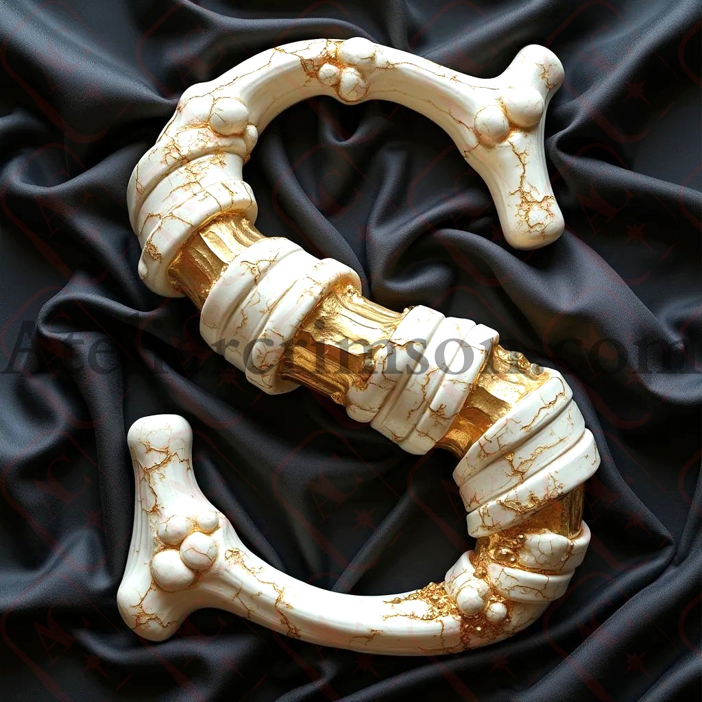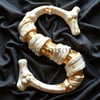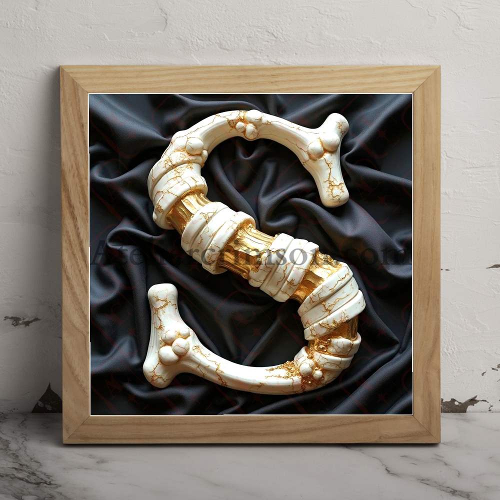 The letter S Bones with gold fissures A hauntingly beautiful character crafted from pristine human femur bones, intricately arranged to form a bold, serif typeface. Delicate golden fissures, reminiscent of kintsugi art, weave through the ivory-white osseous structure, adding an element of elegant repair. The character stands proudly on a luxurious marbled floor, its form casting subtle shadows. Behind it, a textured black linen backdrop provides a striking contrast, emphasizing the letter's ethereal beauty.