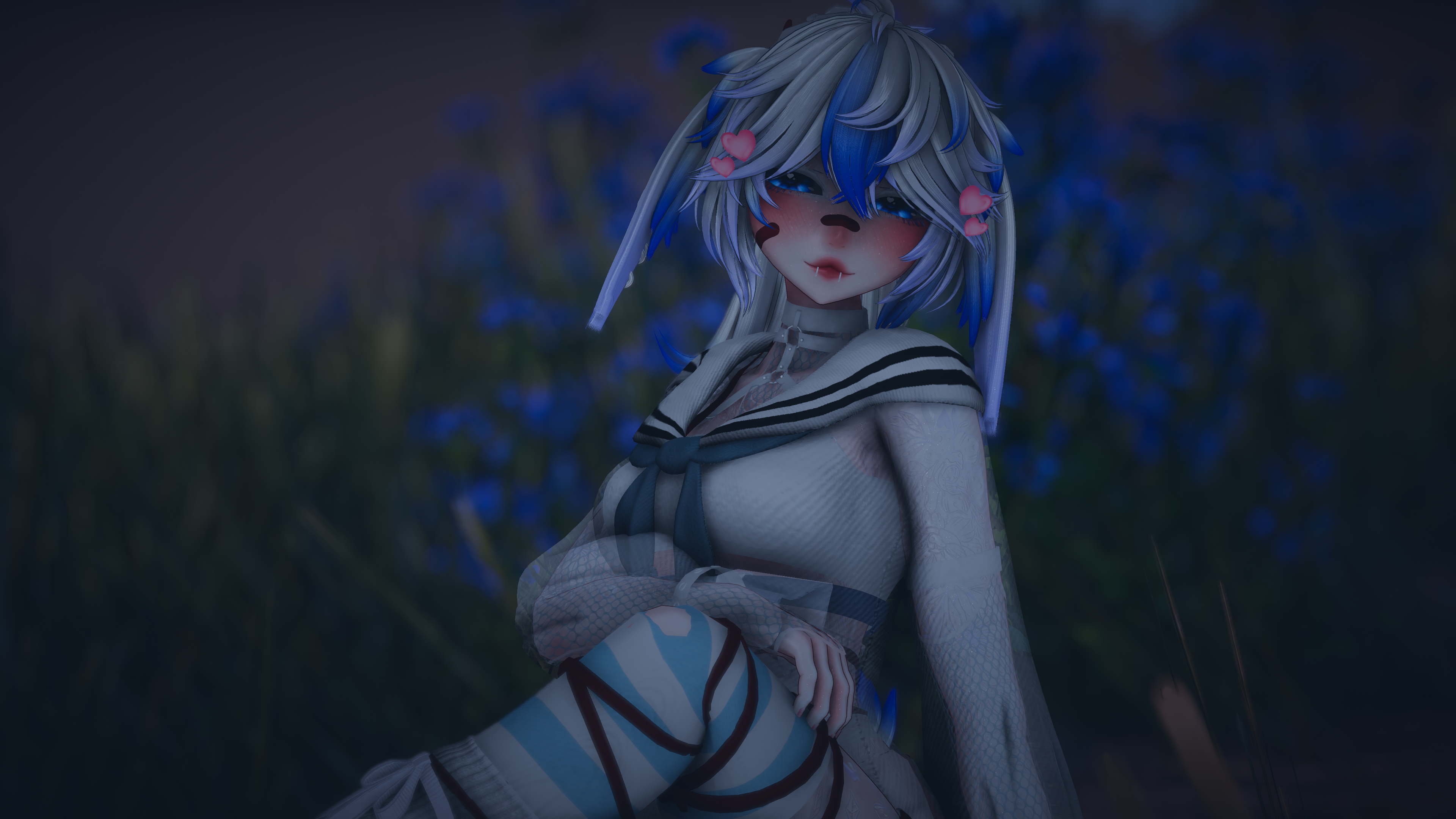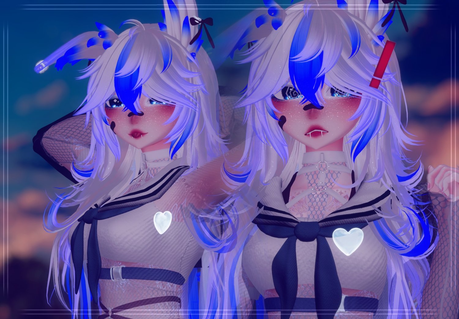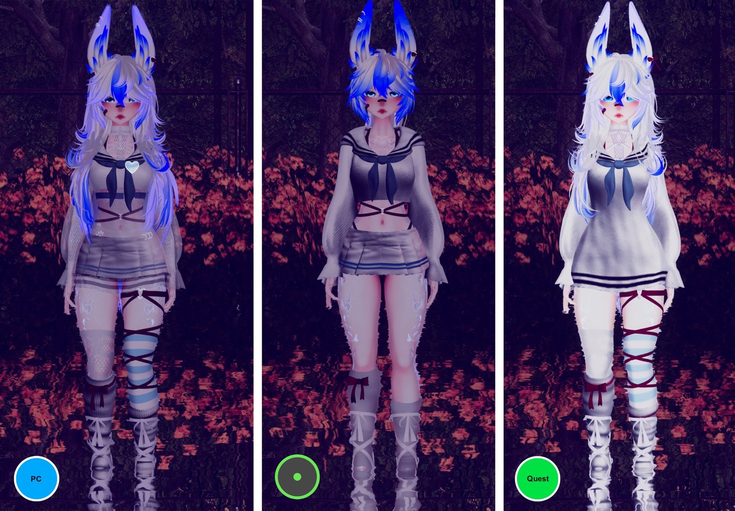 Additional Things: Hand drawn Icons, Ear movement (Poseable radial with Idle animations), Blink Idle animation, Custom Index + Facial gestures, Several Scratch / handmade assets, New quest materials + matcaps, improved thigh physics (Jiggly and squishable)