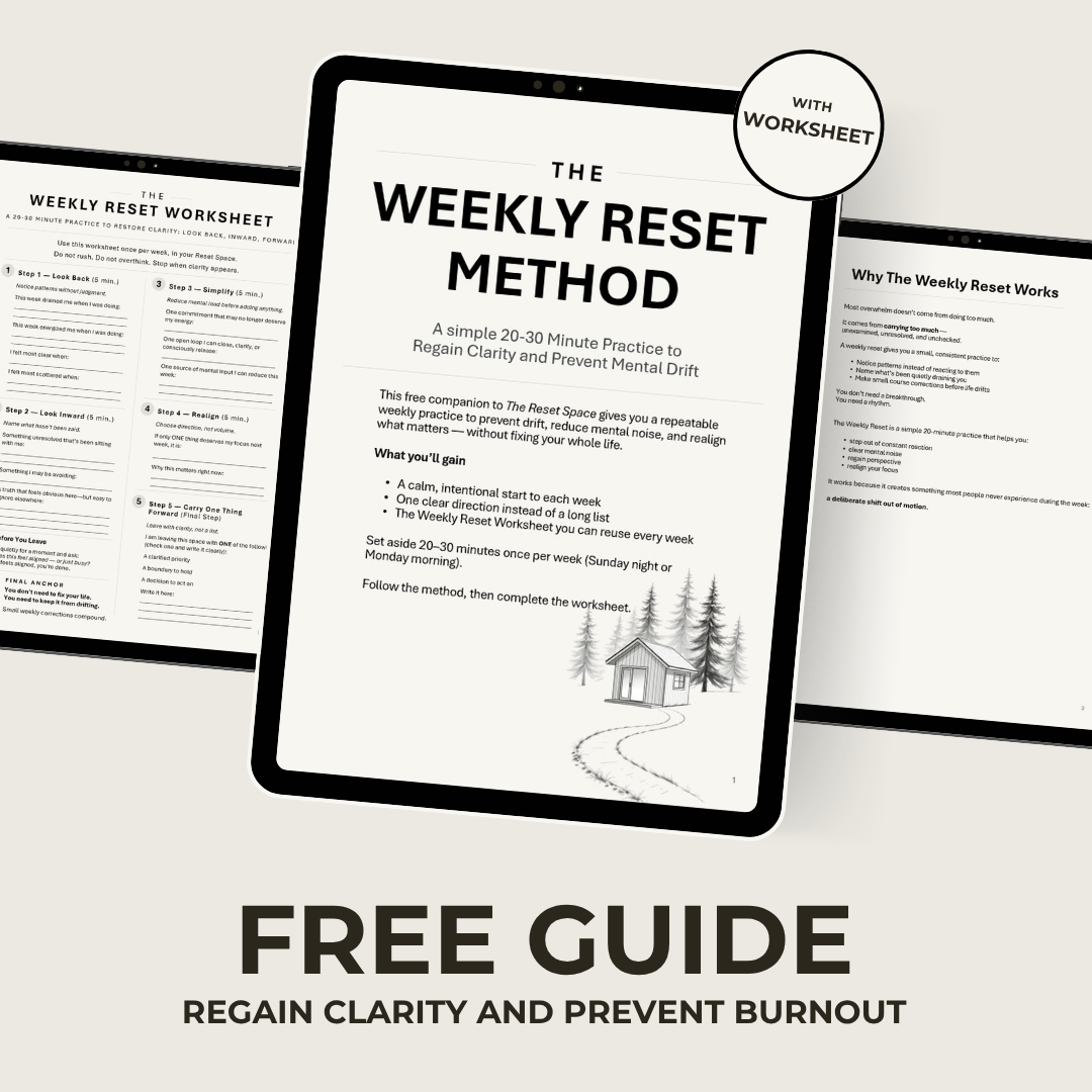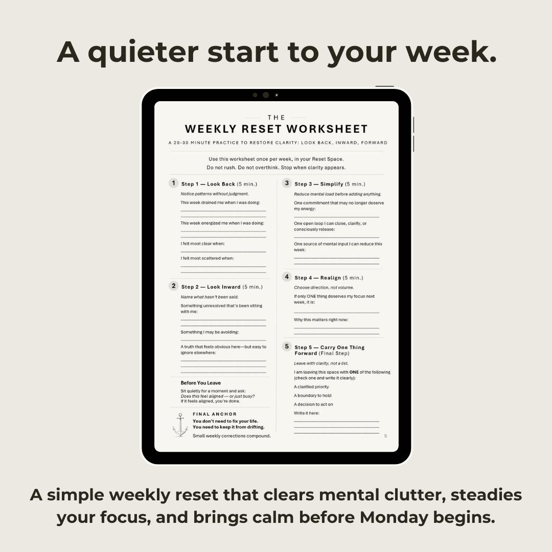 The Weekly Reset Method is a free worksheet and guide designed to help you step out of that mental noise and re‑orient what matters.