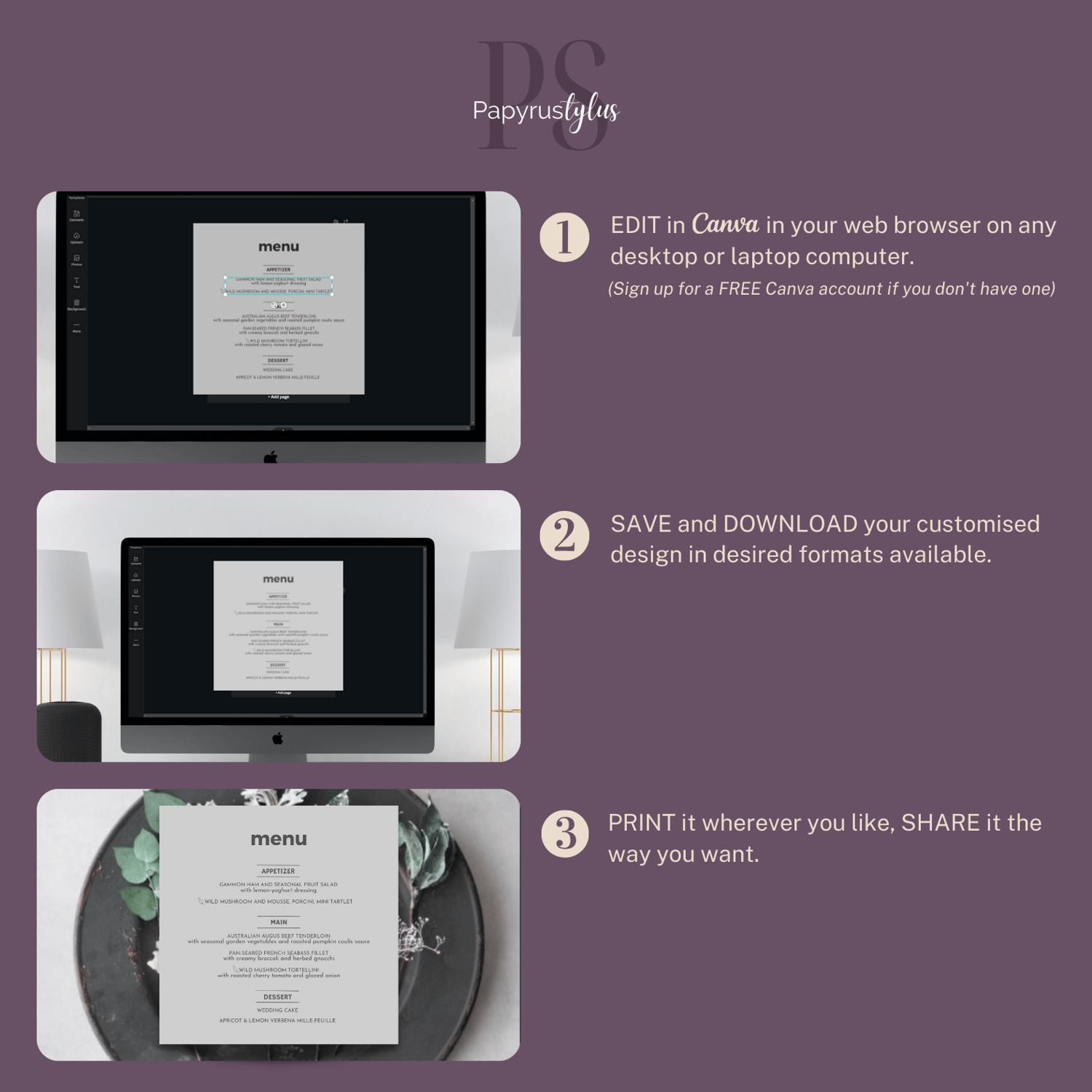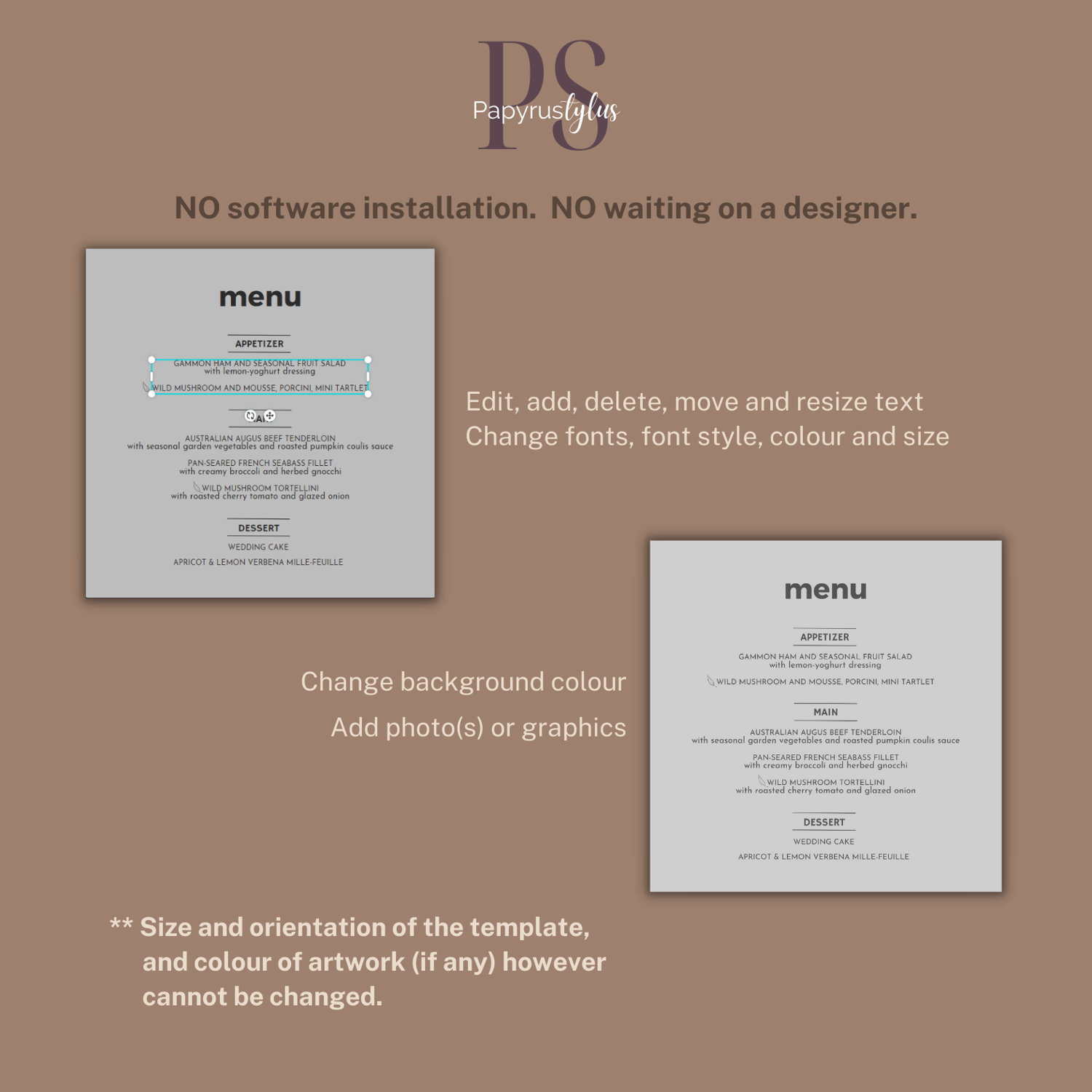 This cool menu template features a simple and minimalist layout with double-sided design in contrasting colour. It can also be easily customised to match the theme of your Big Day!