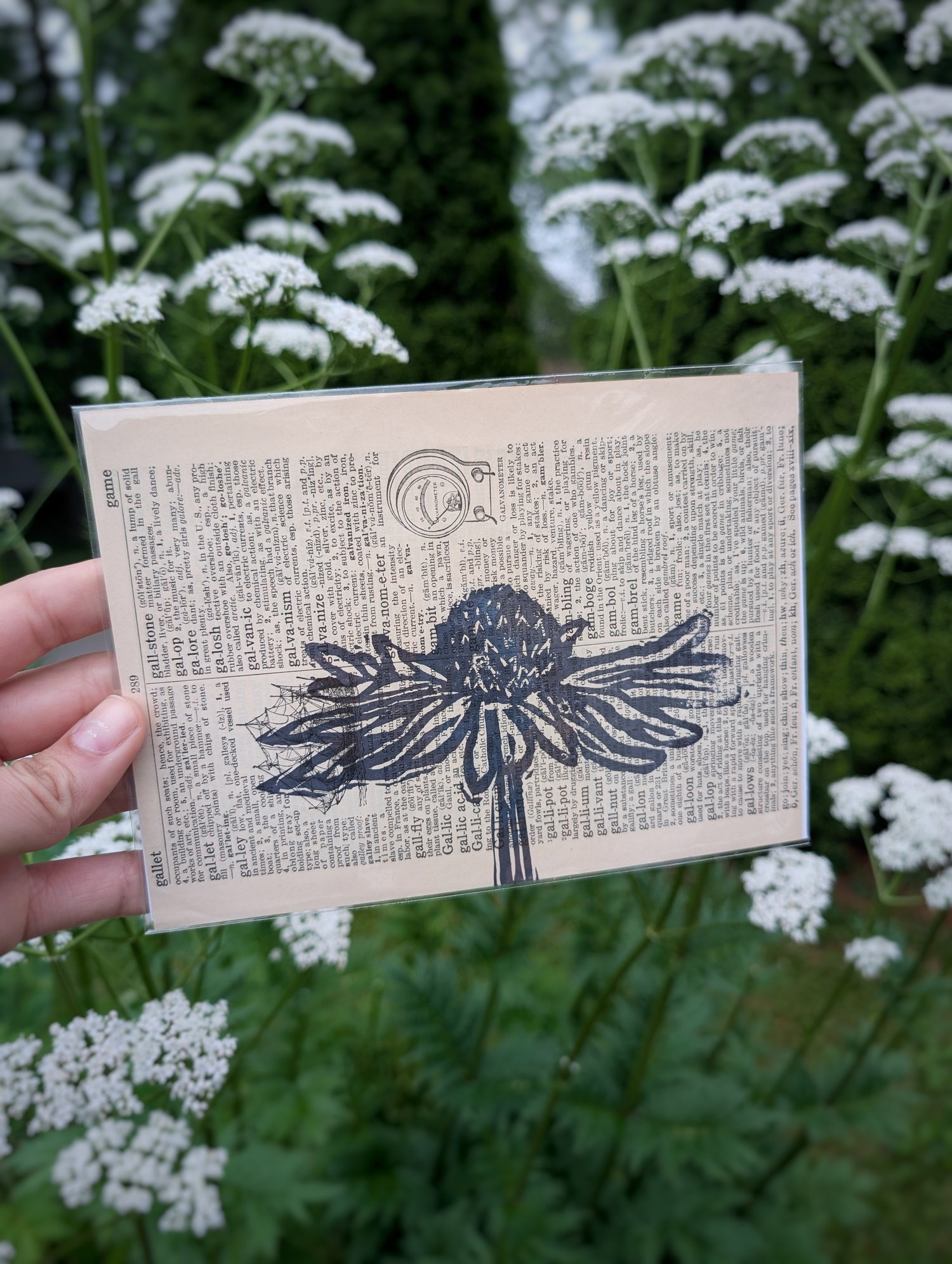 5x7 inch hand illustrated linocut print on vintage illustrated dictionary pages. These pieces are truly one of a kind- due to the nature of book pages and the nature of lincout prints, each print is going to look a bit different and feature slightly different book page illustrations.