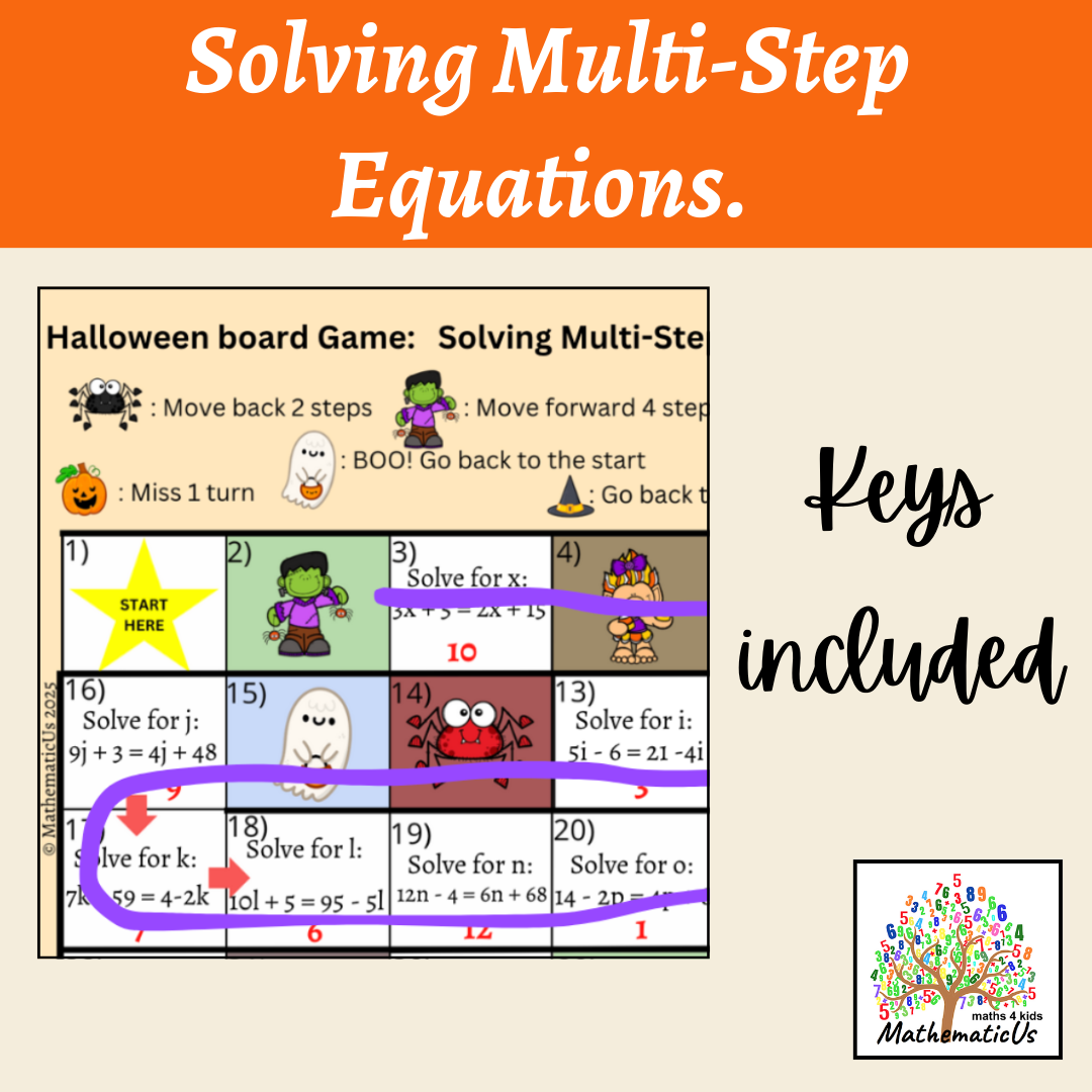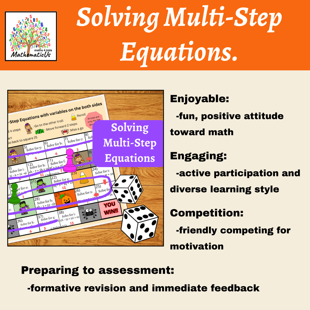 It is a Solving Multi - Steps Linear Equations Halloween board game. Children have to solve linear equations with variables one the both sides of the equations. They will use collecting like terms and addition, subtraction, multiplication and division .