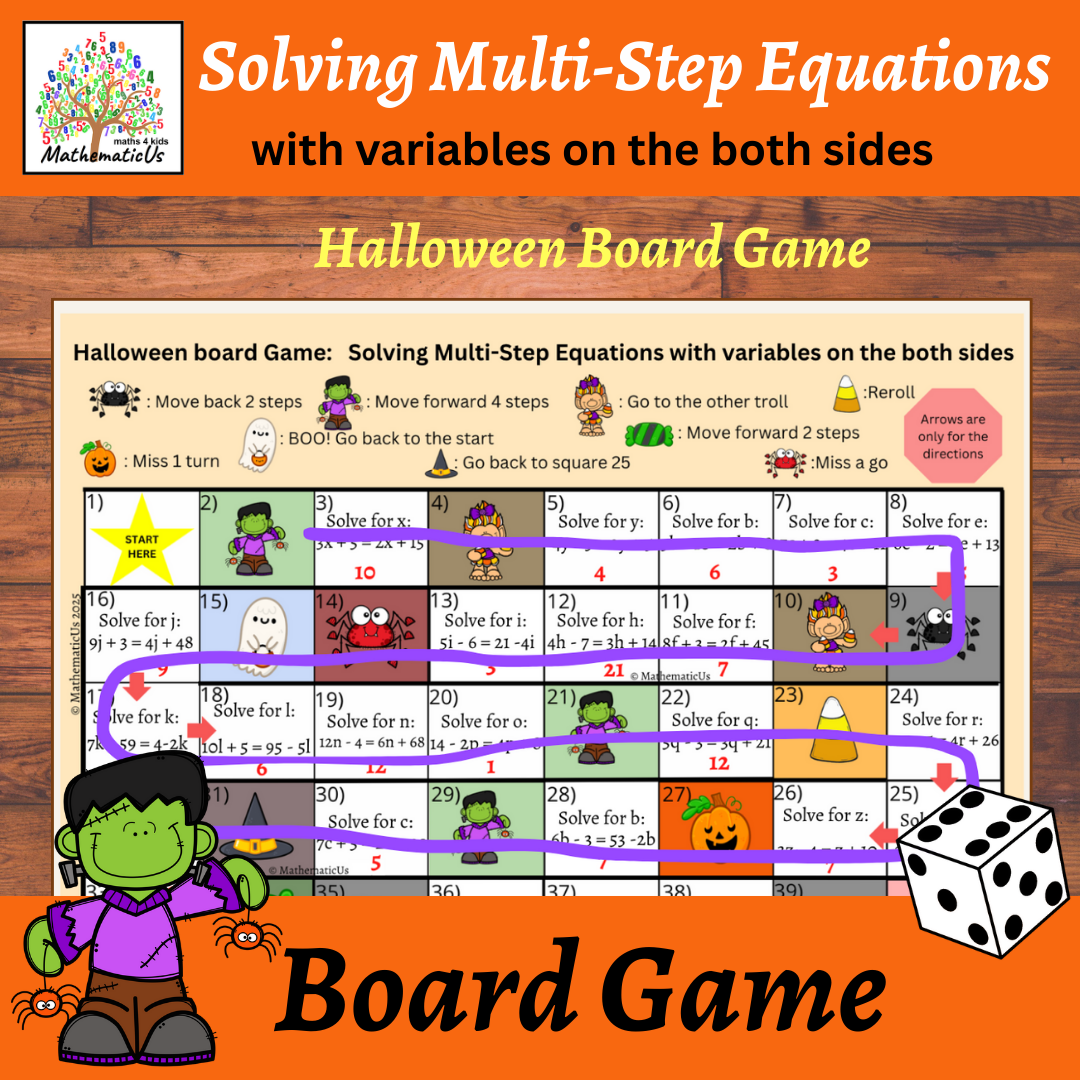 Solving Multy-Steps Linear Equations Maths Halloween board Dice Game
