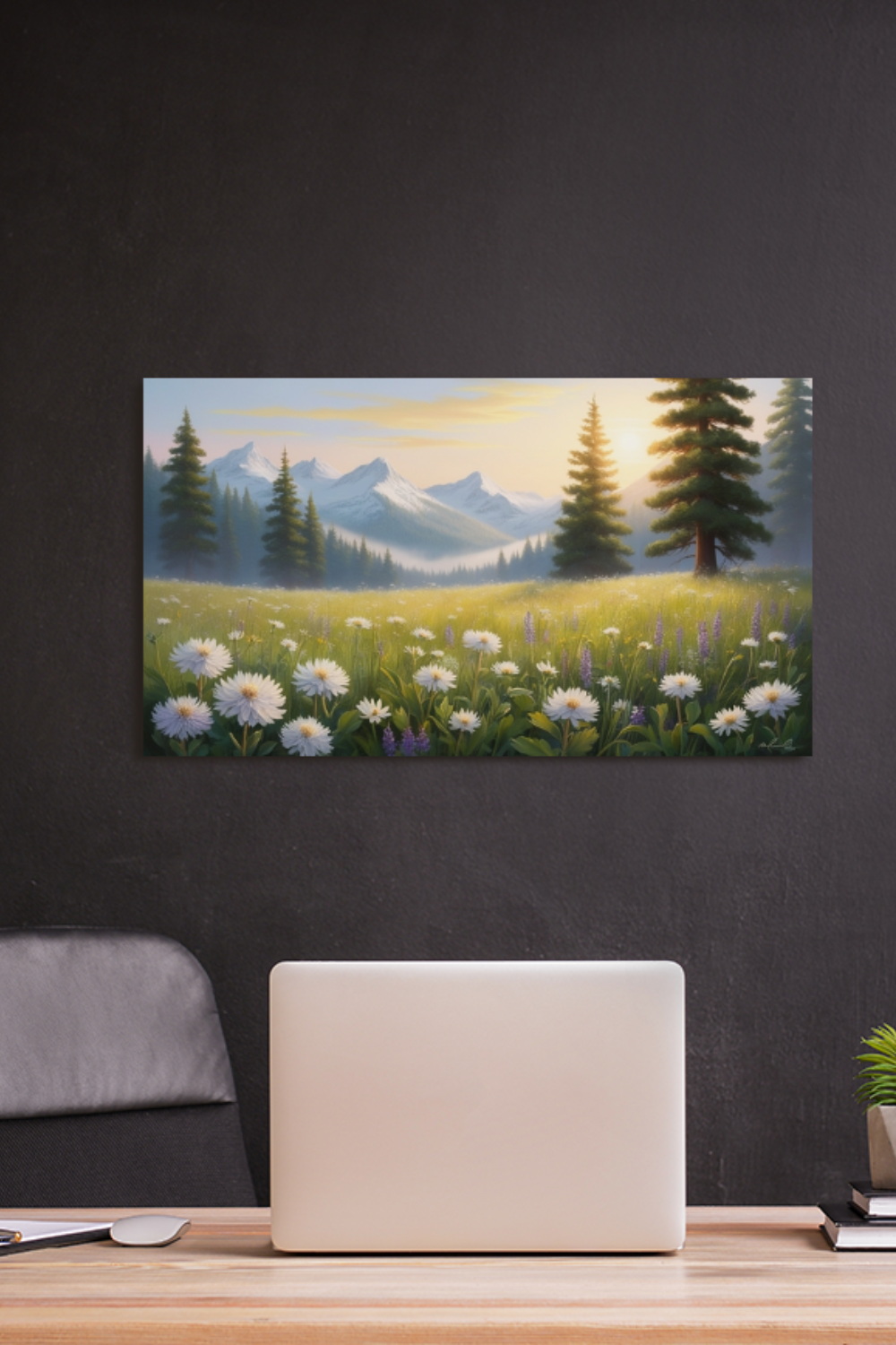 Transform your home or office with "Golden Sunrise Over Alpine Meadows," a breathtaking artwork that captures the magic of dawn in the wilderness. Feel the tranquility as sunlight filters through evergreens, illuminating a field of delicate wildflowers, with majestic snow-capped peaks rising in the distance. 🏔️🌸