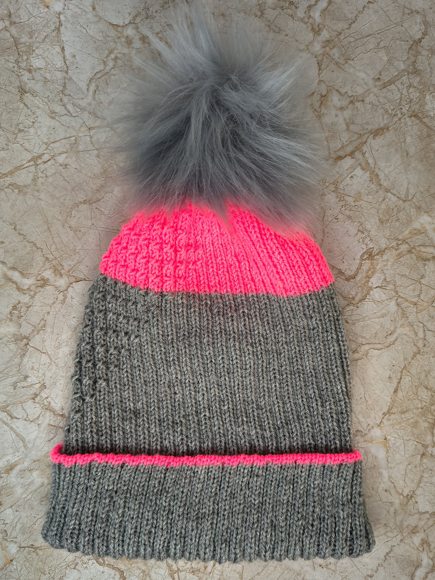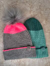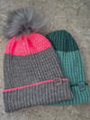 The beanie is worked in the round from the bottom up. It starts with a tubular cast-on method that includes a color change, then the cuff is worked in 2x2 ribbing and folded. The body is worked in the same ribbing with the addition of some easy 1x1 twisted cables. After a final color change at the top of the hat, the crown is worked with simple decreases. Lastly, if that’s your style, top the beanie with a big pom-pom.