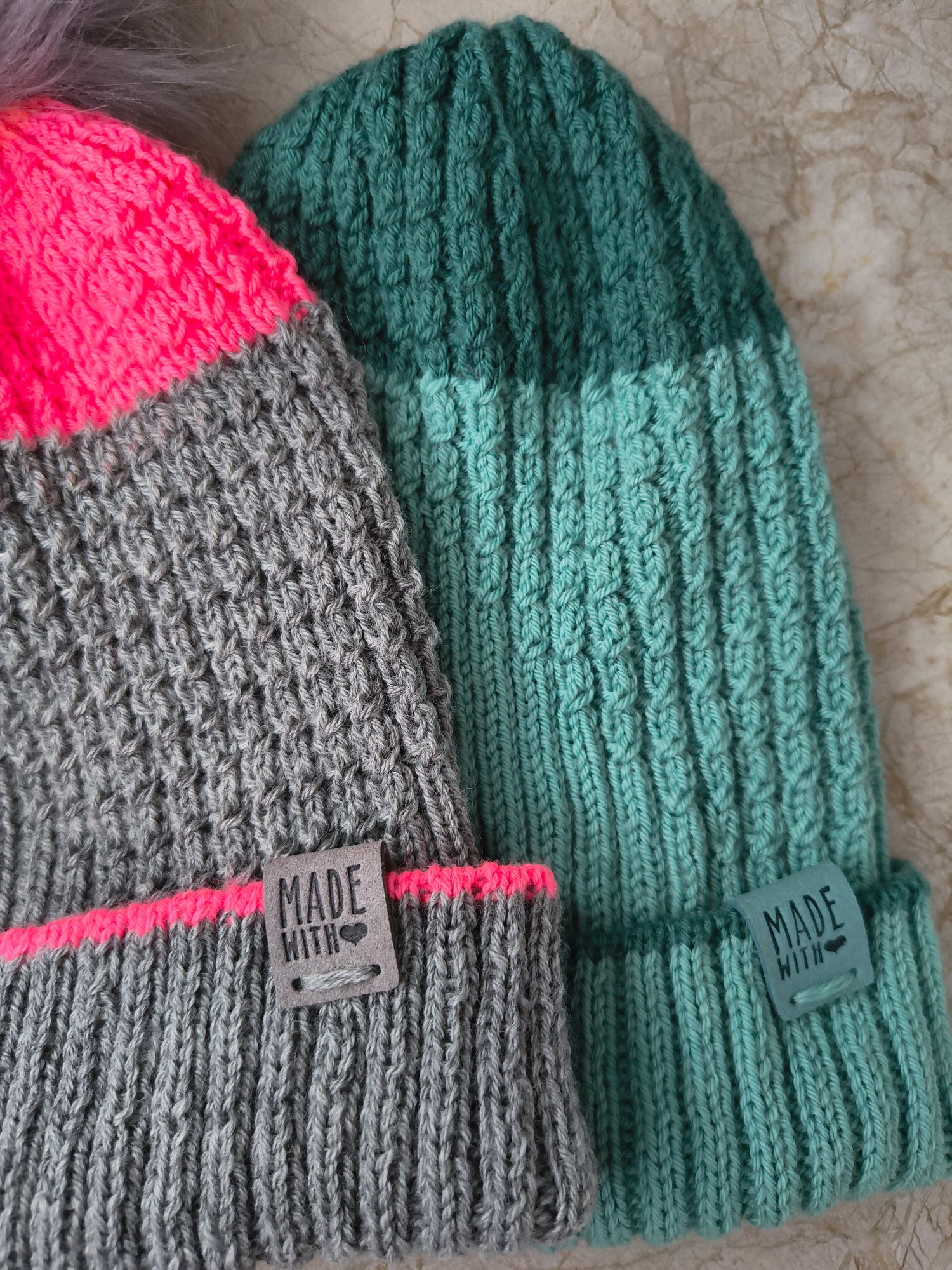 Yarn used for sample: Valley Yarns Huntington, fingering weight yarn [CYCA 1] (50 g/1.8 oz, 199 m/218 yds, 75% Merino wool, 25% nylon) – for the aqua and green hat 1 skein in #28 Arctic (MC), 1 skein in #29 North Sea (CC); for the gray and pink hat 1 skein in #35 Light Grey Heather (MC);