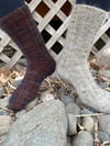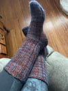I designed these socks for a basic need, to keep my feet warm in these cold Montana winters. They serve that purpose very well. A word of caution, if you have hardwood floors, be careful if you knit with mohair, the socks become extra slippery. If you have kids or grandkids, they will love that aspect, my kids love to ‘skate’ on the floors with hand knit socks.