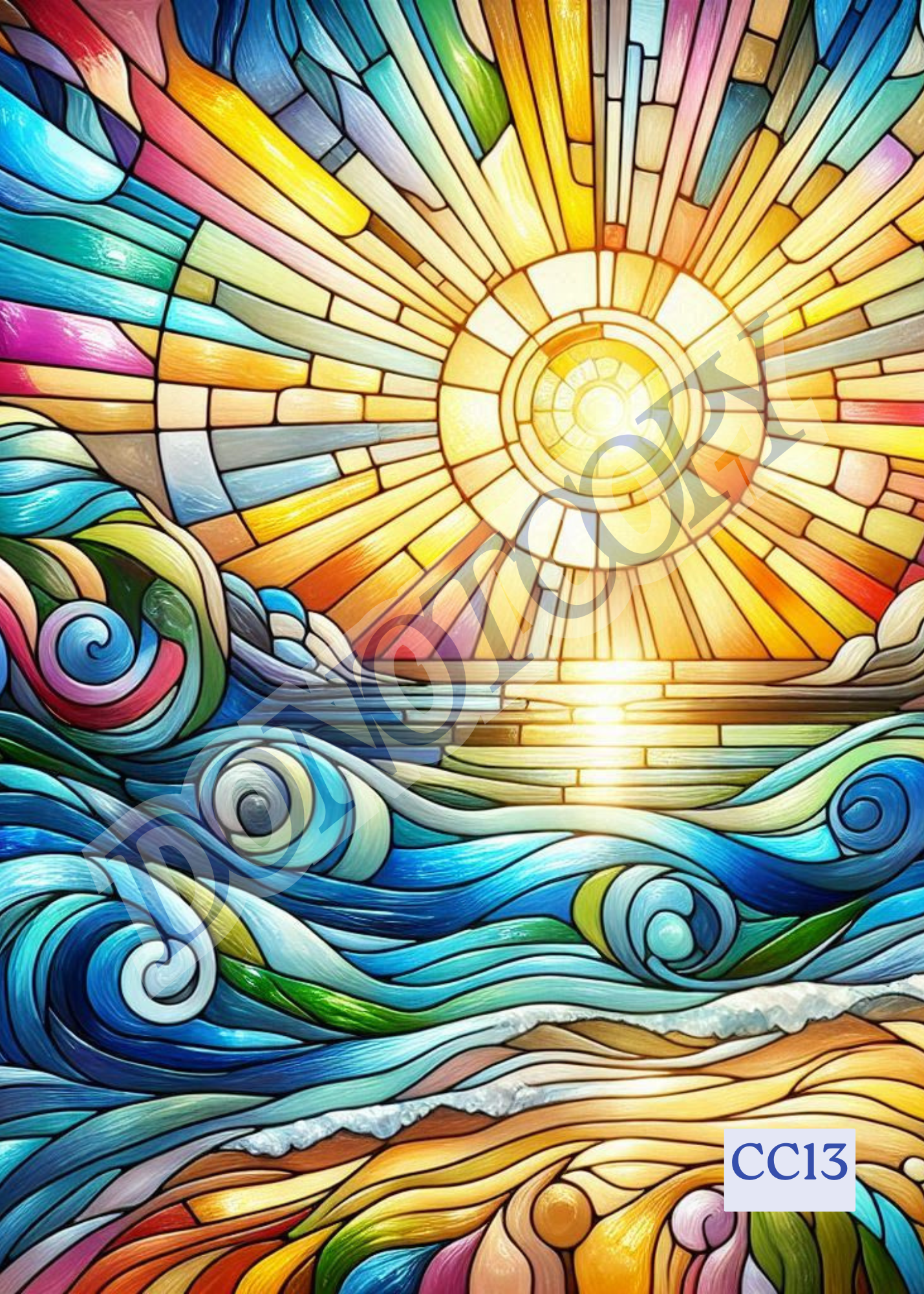 Anchored in Light is a celebration of connection, to self, to others, and to something greater. The brilliant sun illuminates the waves of life, while bold currents swirl with energy and motion. At the shoreline, colorful figures stand grounded in love, strength, and unity. This stained glass-inspired image is a reminder that even in chaos, we can rise, shine, and stay rooted in gratitude and light.