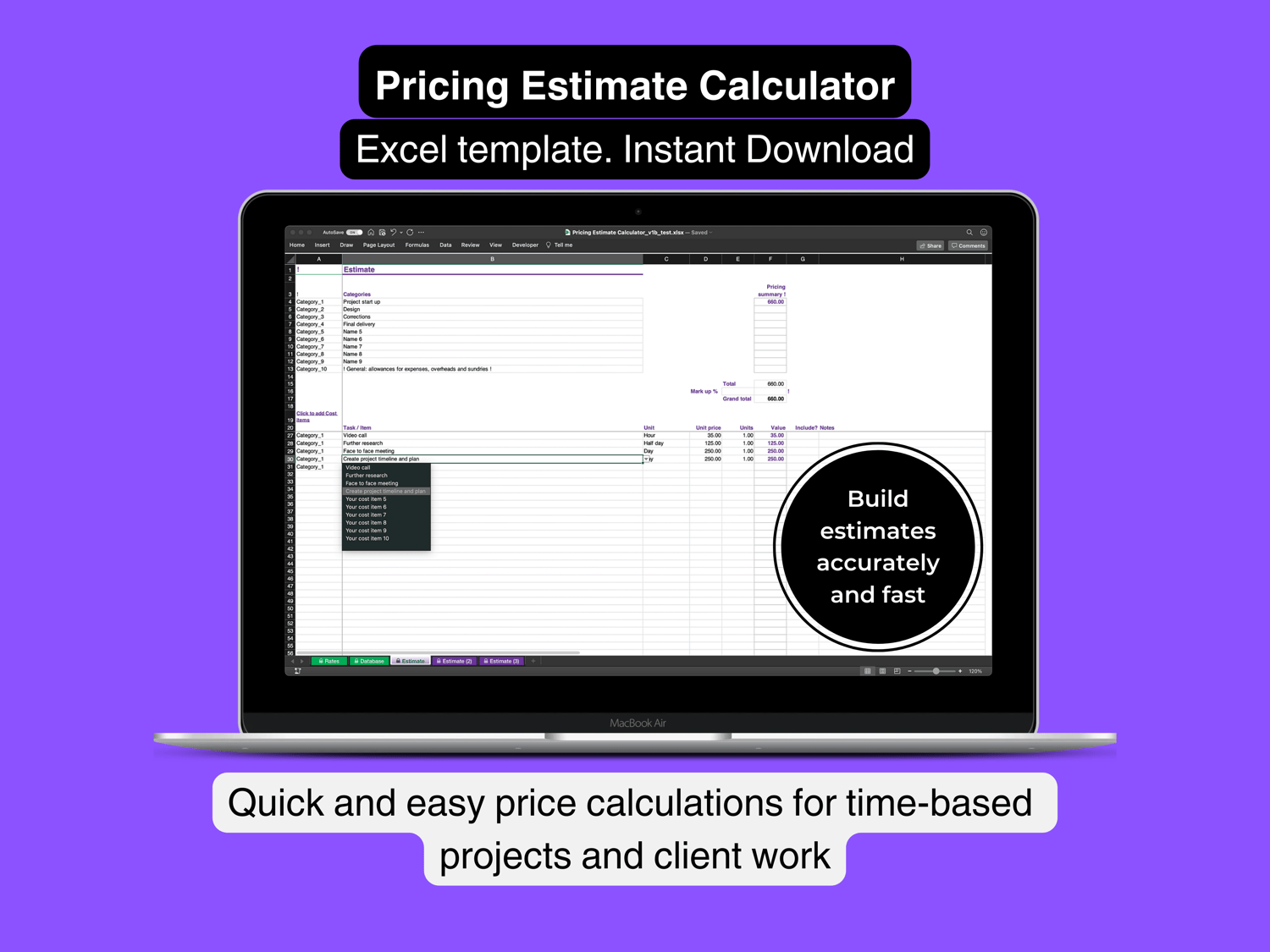 Pricing Estimate Calculator spreadsheet for Freelancers, Sole Traders, Small Business, Agencies, Projects