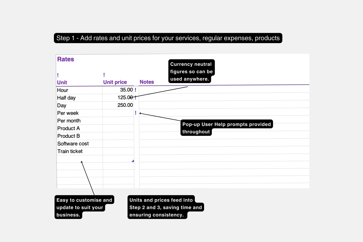 Sheet 1 - Set up Rates and other costs. Add your hourly, daily etc billing rates as well as other regular cost types (such as products, software costs, expenses, materials and other overheads)