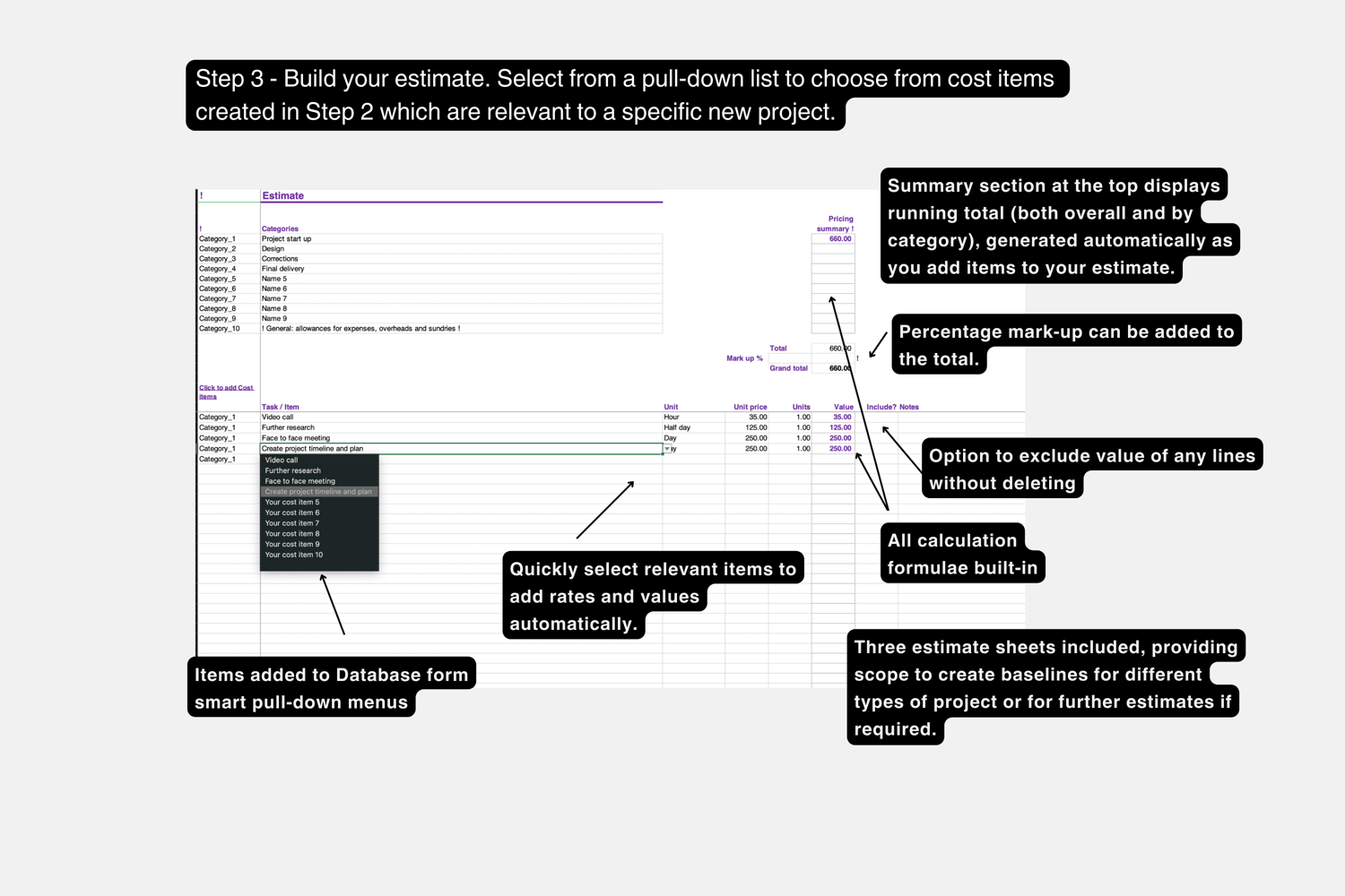 Sheet 3 - Create Estimate. Select from a pull-down list to choose cost items relevant to a specific new project. This draws from your database and pulls though rates etc automatically to rapidly build your new estimate.