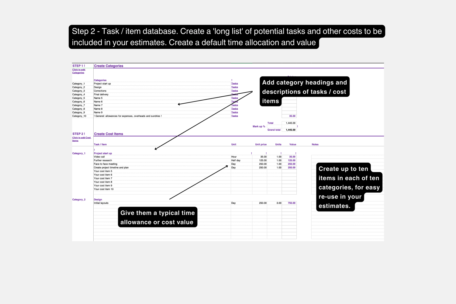 Sheet 2 - Cost item database, a 'long list' of potential tasks and other costs to be included in your estimates - add category headings and descriptions of tasks / cost items and give them a typical value (up to ten items in each of ten categories).
