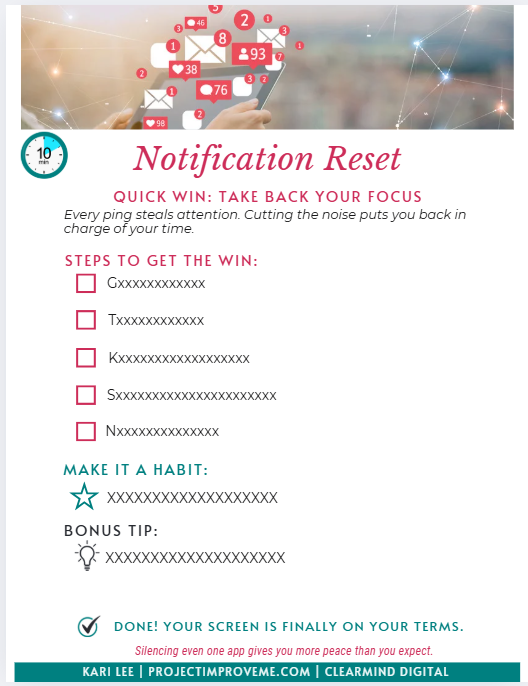 Inside, you’ll find 12 step-by-step checklists designed for midlife women who want fast results without tech overwhelm. Each takes just 5–20 minutes and helps you reclaim time, focus, and calm.