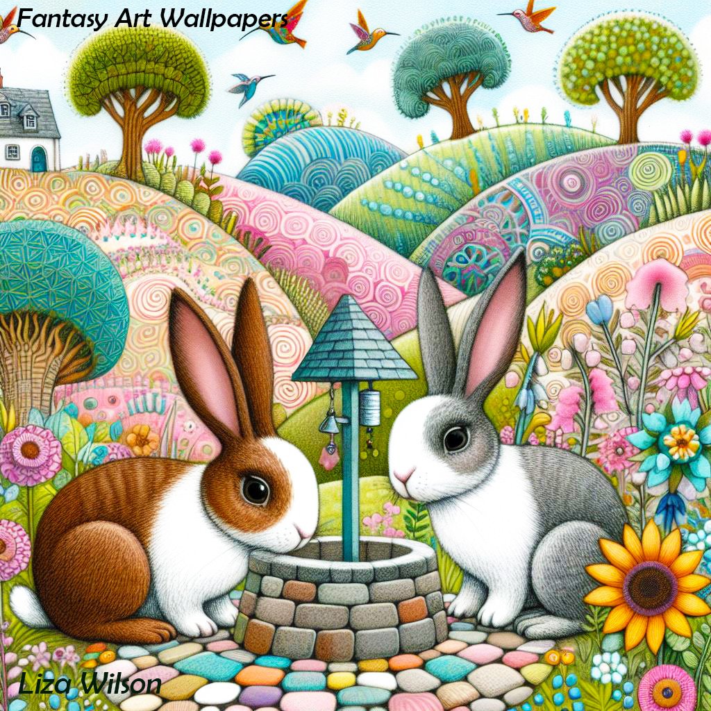 Cute rabbits on high patterned hills by a wishing well. There are flowers, trees & humming birds.