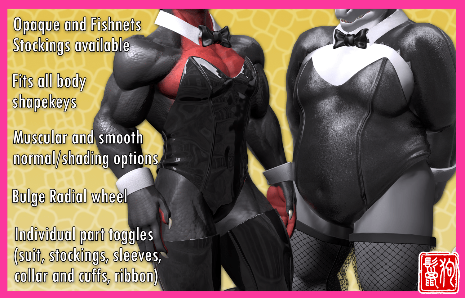 - The bunny suit is compatible with all body modification shapekeys on both avatar bases!