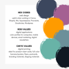 + Detailed Hex Codes, RGB, and CMYK values for each color
