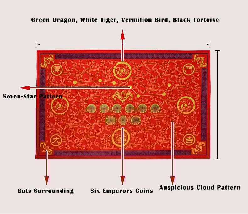 Good Fortune Series–Feng Shui Power Mat Seven-Star Pattern, Bats, Six Emperors Coins, and Legendary Creatures for Prosperity and Protection