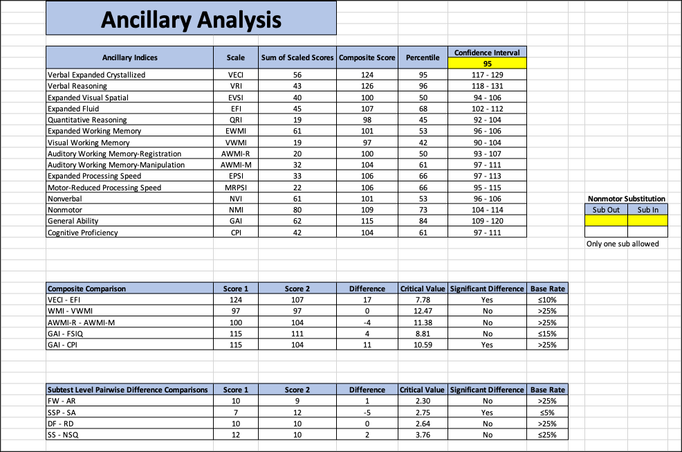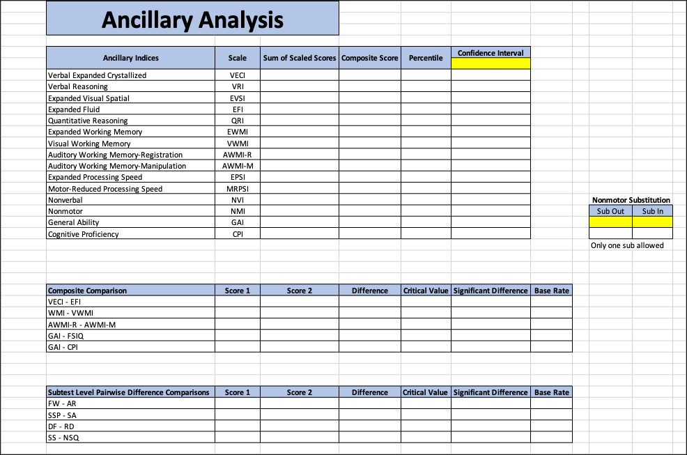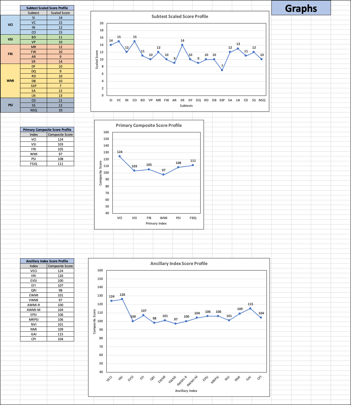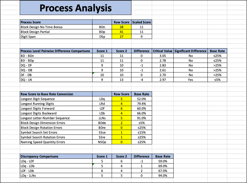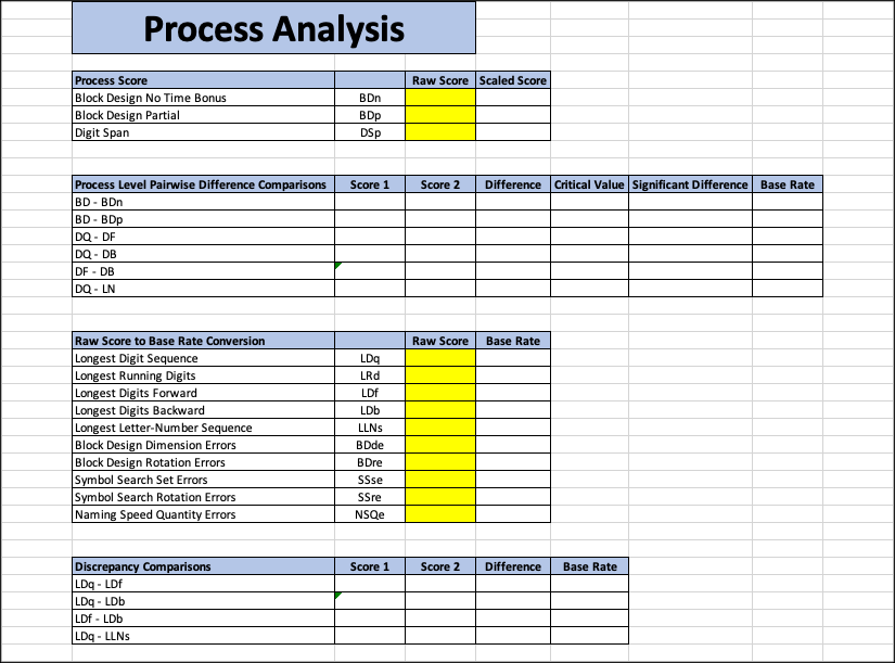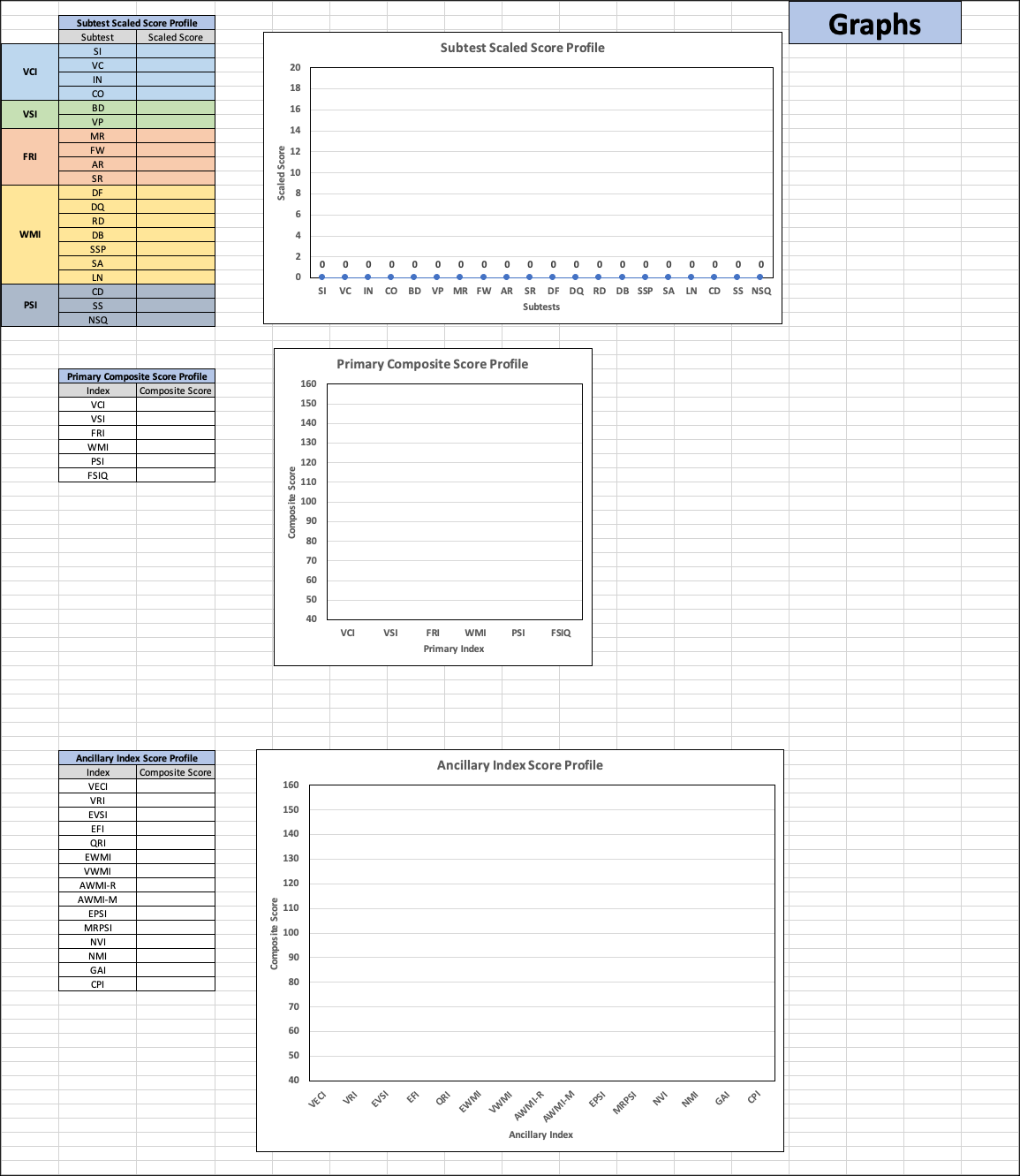 A quick way to score the WAIS-5 (Wechsler Adult Intelligence Scale - Fifth Edition). All you have to do is enter in the dates and subtest raw scores into the yellow cells after administering the test and the easy to use excel form will automatically fill in the Scaled scores, Composite scores, comparisons, strengths/weaknesses, base rates and create three graphs describing the test results. Included is one spreadsheet with four tabs (one for subtest raw scores and primary analysis, one for process analysis, one for ancillary analysis and one for graphs). This AutoScoring template uses American norms only and does not include any test materials. The template should only be used by mental health and medical professionals with at least some experience scoring the WAIS-5.